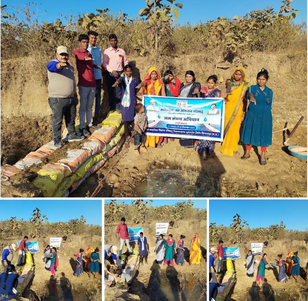 म.प्र. जन अभियान परिषद भोपाल के आदेशानुसार जिला कलेक्टर श्री हरेंद्र नारायन के निर्देशानुसार म.प्र. जन अभियान परिषद छिंदवाड़ा के जिला समन्वयक श्री अखिलेश जैन व ब्लॉक समन्वयक श्री संजय बामने की उपस्थिति में विकासखंड जुन्नारदेव के सेक्टर क्रमांक-3 पालाचौरई की नवांकुर योजना में चयनित संस्था पंख सामाजिक विकास संस्थान जुन्नारदेव की सदस्य सुश्री विनीता पंद्राम के साथ मिलकर जल संचय अभियान के अंतर्गत मुख्यमंत्री सामुदायिक नेतृत्व क्षमता विकास कार्यक्रम अंतर्गत बीएसडब्ल्यू/एमएसडब्ल्यू के अध्यनरत छात्र- छात्राओं ने जल संरक्षण के उद्देश्य से ग्राम पंचायत बुर्रीकलां में रैनीधाम रोड़ में स्थित गहरा नाला पर बोरी बंधान किया गया।