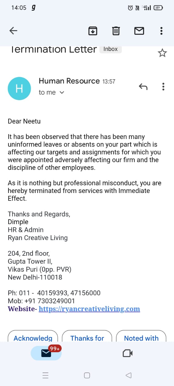 हरियाणा राज्य के झज्जर ज़िला से मनोहर लाल कश्यप ,श्रमिक वाणी के माध्यम से बताते है कि दिल्ली के विकासपुरी से की एक महिला श्रमिक नीतू ,204 ,सेकंड ,फ्लोर ,गुप्ता टावर स्थित कंपनी क्रिएटिव लिविंग में काम करती थी। नीतू डिज़ाइनर के रूप में कार्यरत थी। कंपनी के एचआर ,मैनेजर द्वारा नीतू को अचानक काम से हटा दिया गया और न ही उन्हें वेतन दिया जा रहा है। वेतन देने पर साफ़ मना किया जाता है। और धमकी वाले लहज़ा से बात करते है। कंपनी से बात करने पर भी कोई काम नहीं बना। सुनने में आया है कि कंपनी द्वारा पहले भी कई कर्मचारियों से साथ धोखा किया गया है