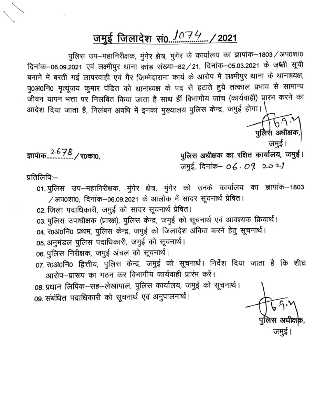 जमुई के लक्ष्मीपुर थाना के मशहूर थानाध्यक्ष मृत्युंजय कुमार पंडित को आखिरकार लापरवाही महंगी पड़ी।जमुई एसपी प्रमोद कुमार मंडल ने लक्ष्मीपुर थानाध्यक्ष को तत्काल प्रभाव से निलंबित कर दिया। विस्तृत जानकारी के लिए ऑडियो पर क्लिक करें और पूरी खबर सुनें।
