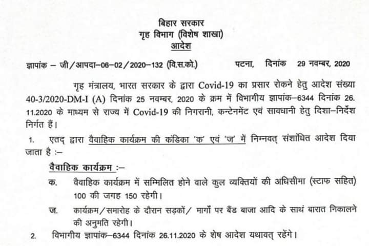 बिहार सरकार ने जारी किया गाइडलाइन अब शादी में 100 से ज्यादा लोग होंगे शामिल | विस्तृत जानकारी के लिए ऑडियो पर क्लिक करें और पूरी खबर सुने |