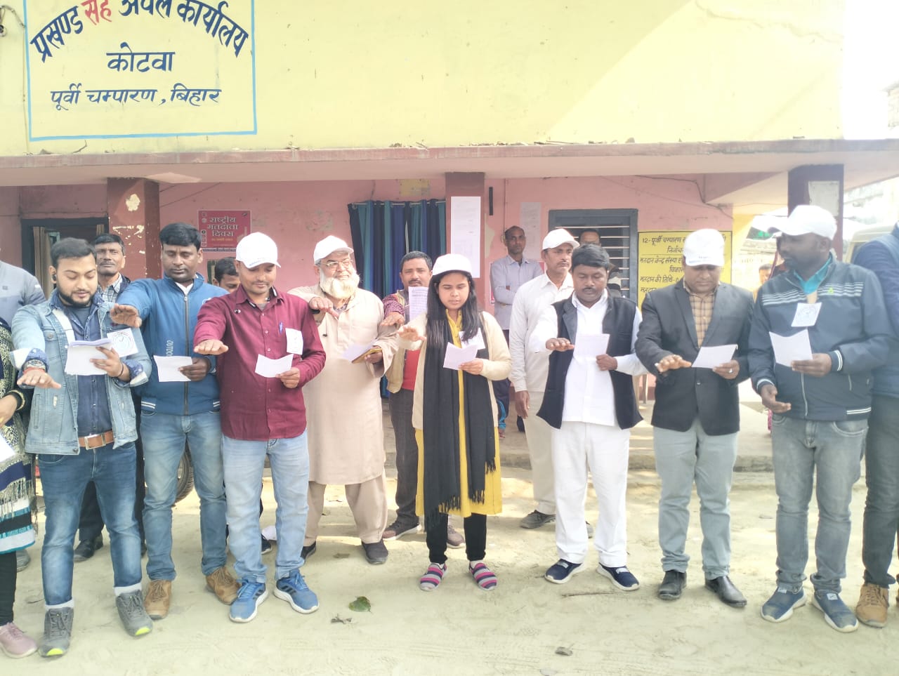 कोटवा प्रखंड के बीडीओ ने दिलाई निष्पक्ष मतदान करने की शपथ प्रखंड के सभी बूथों पर मतदाता जागरूकता दिवस मनाया गया कोटवा:( पूर्वी चंपारण)।कोटवा प्रखंड कार्यालय में बुधवार को मतदाता दिवस मनाया गया।इस अवसर पर बीडीओ सरीना आजाद द्वारा लोगो को मतदान से संबंधित शपथ दिलाई गई।कार्यक्रम में शामिल लोगो को बीडीओ सरीना आजाद ने देश की लोकतांत्रिक बनाए रखने तथा स्वतंत्र ,निष्पक्ष एवम शांतिपूर्ण गरिमा को अक्षुण्ण रखते हुए, निर्भीक होकर,धर्म,जाति,समुदाय, भाषा और किसी भी प्रलोभन से प्रभावित नही होकर मतदान करने की शपथ दिलाई गई।आगे बीडीओ ने बताया कि प्रखंड के सभी बूथों पर मतदाता दिवस के अवसर पर बीएलओ मौजूद रहे। मौके पर शिक्षक सुरेंद्र कुमार सिंह, मोहम्मद शमीम अख्तर, विवेकानंद कुमार, प्रमुख पति सुनील दास, सांख्यिकी पदाधिकारी श्री कुमार, मनकेश्वर प्रसाद, संतोष कुमार ,संतोष कुमार श्रीवास्तव, संजय कुमार, रामाधार शर्मा, सत्येंद्र प्रसाद यादव ,अमरेश कुमार, मोहम्मद नौशाद ,देवी लाल कुमार, मदन कुमार ,कन्हैया प्रसाद सिंह ,राजीव कुमार, प्रेम प्रकाश कुमार उर्फ गब्बर सिंह, दिलीप कुमार दुबे, अनिता कुमारी शारदा कुमारी संगीता कुमारी, आशु कुमारी, किरण खजूर, सहित कई प्रबुद्ध लोग शामिल थे।