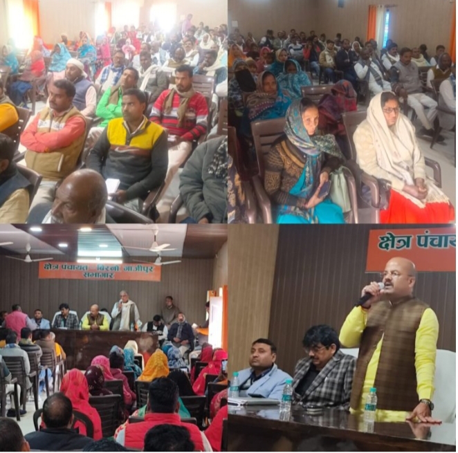 बिरनो- ब्लॉक में हुई ग्राम प्रधान व बीडीसी की बैठक की गई ब्लॉक प्रमुख राजन सिंह के नेतृत्व में यह कार्यक्रम किया गया विकास खंड अधिकारी राजेश यादव ने बताया कि पिछले वित्तीय वर्ष में ग्राम पंचायत क्षेत्र पंचायत द्वारा किए गए कार्यों को पटल पर रखा गया है हर गांव में इंटरलॉकिंग नाली आरसीसी और पौधरोपण के माध्यम से नई क्रांति आई है और क्षेत्र के अवरुद्ध कार्यों को सफल कराए जाने का निर्णय लिया गया वृद्धा पेंशन निराश्रित महिला पेंशन दिव्यांग पेंशन 15वां वित्त एवं राज्य वित्त योजनाओं पर भी विचार किया गया है ब्लॉक प्रमुख राजन सिंह ने कहा कि निस्वार्थ भाव से बीडीसी से प्रस्ताव मांगा गया सरकार की मनसा तभी पूरा होगी जब तक हर व्यक्ति को अंतिम योजना का लाभ मिल ना जाए संचालन कर रहे सचित्र नाथ उर्फ लल्लन सिंह ने कहा कि कुल 145 प्रस्ताव मिले हैं कमेटी बनाकर ब्लॉक क्षेत्र में कार्य किया जाएगा पूर्व ब्लाक प्रमुख सुभाष गुप्ता अभिमन्यु सिंह राजेंद्र यादव विनोद गुप्ता प्रधान देवेंद्र यादव अजीत सिंह प्रमोद मोहित यादव अशोक कुशवाहा धनंजय प्रजापति चंद्रभान अखिलेश सिंह शैलेश विनोद भीष्म सिंह आनंद कुमार रानी विश्वकर्मा दीपक गौड़ रामचरण यादव आदि क्षेत्र पंचायत व ग्राम प्रधान उपस्थित थे