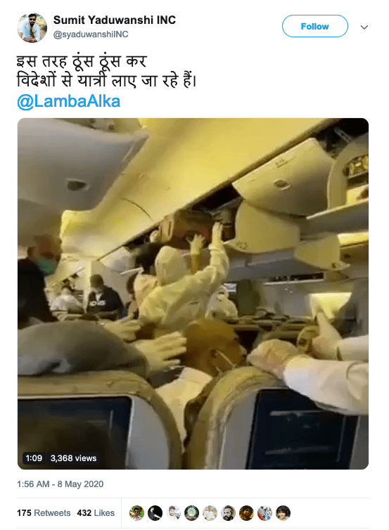 फर्जी खबरें फैलाने वाले तमाम रोक के बाद भी अपनी हरकतों से बात आते दिखाई नहीं दे रहे हैं. हर कोई जानता है कि इस समय विदेशों में फंसे प्रवासी भारतीयों को अपने देश लाने की मुहिम चल रही है. लेकिन इस बीच एक वायरल वीडियो ने सनसनी फैला दी है. वीडियो में एयरलाइन्स के स्टाफ़ के साथ कुछ पैसेंजर्स की बहस हो रही है. एक व्यक्ति को ये कहते हुए सुना जा सकता है कि नॉर्मल दाम से तीन गुना ज़्यादा पेमेंट करने पर भी एयरलाइन सोशल डिस्टैन्सिंग फ़ॉलो नहीं कर रहा है। विस्तृत जानकारी के लिए ऑडियो पर क्लिक करें।