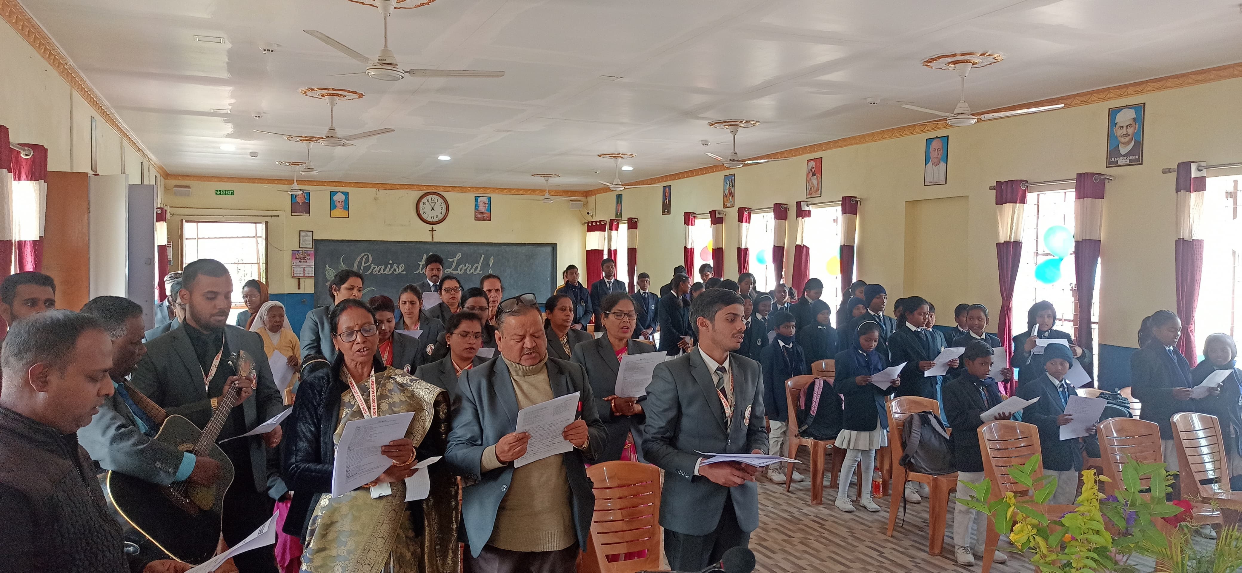 मैक्लुस्कीगंज 31 जनवरी 2024 फ़ोटो 1 - प्रार्थना कराते पुरोहित व सहायक पुरोहित. फ़ोटो 2 - कार्यक्रम में उपस्थित एकेडमी के छात्र छात्रएं व शिक्षक. मैक्लुस्कीगंज स्थित डॉन बॉस्को एकेडमी में संत जॉन बॉस्को की पुण्य तिथि सेंट डॉन बॉस्को डे के रूप में मनाया गया. कार्यक्रम की शुरुआत लपरा पल्ली पुरोहित फादर हुबेरतुस बेक, पुरोहित विल्फ्रेड, एकेडमी के सहायक प्रचार्य जोशी टीडी व शिक्षक जॉली जोसेफ़ द्वारा संयुक्त रूप से एकेडमी परिसर में स्थापित संत जॉन की प्रतिमा के समक्ष मोमबती जलाकर व पुष्प अर्पित कर किया. समारोह में संत जॉन के जीवनी पर प्रकाश डाला गया, बताया गया कि सन्त जॉन का जन्म एक किसान के घर हुआ था. उनकी शिक्षा दीक्षा में माता पिता की गरीबी आड़े थी, फिर भी वे अपने कर्तव्यों के प्रति निष्ठावान रहे. जॉन बॉस्को के बारे में बताया गया कि उन्होंने अपना जीवन सड़क के किनारे गुज़र बसर करने वाले बच्चों, किशोर, अपराधी और न्याय से वंचित युवाओं की बेहतरी और शिक्षा के लिए समर्पित कर दिया. उन्होंने सज़ा के बजाये स्नेह, क्षमा, दया, त्याग पर आधारित शिक्षण विधियों का विकास किया, पुरोहितों ने कहा कि प्रतापी पुरुष को धन्य व बाद में वे संत घोषित हुए और युवाओं के पिता व शिक्षक संत जॉन बॉस्को के रूप में विख्यात और डॉन बॉस्को के नाम से लोकप्रिय हुए. पुरोहित ने एकेडमी में आयोजित पूण्य तिथि समारोह में उपस्थित छात्रों को भी संत की प्रेरणादायी कार्यो से प्रेरणा लेते हुए क्षमा, दया, त्याग की भावना को अपनाने की बात कही. इस दौरान एकेडमी के छात्रों के बीच नृत्य, गीत, क्विज, चित्रांकन प्रतियोगिता का आयोजन किया गया. इस अवसर पर राकेश शाह, जीना जोशी, शांति लकड़ा, विजय कुमार, मैक्सवेल डेविडसन, निशा लॉरेंस स्ट्रांग, मुकेश कुमार, जोभी जोशी, शीतल, केपी मोहन्ती, वैभव प्रभू, पंकज कुमार, टिके प्रसाद, जैसन बैरेट सहित बड़ी संख्या में छात्र उपस्थित थे.