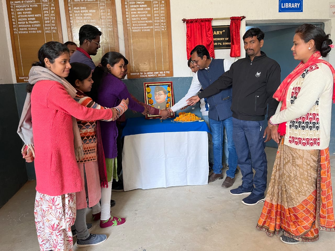मैक्लुस्कीगंज 23 जनवरी 2024 फ़ोटो 3 - दीप प्रज्ज्वलित करते प्राचार्य सहित अन्य शिक्षक. मैक्लुस्कीगंज इंटर कॉलेज में कॉलेज में सुभाष चंद्र बोस की 127वीं जयंती पराक्रम दिवस के रूप मे मनाया गया. कार्यक्रम की शुरुआत कॉलेज के प्राचार्य मनोज कुमार शर्मा एवं सहयोगी शिक्षकों बे संयुक्त रूप से नेताजी के तस्वीर के समक्ष दीप प्रज्ज्वलित व पुष्प अर्पित कर किया. प्राचार्य शर्मा ने सम्बोधित करते हुए नेताजी जी सुभाष चंद्र बोस की जीवनी और भारत की आजादी की लड़ाई में उनके योगदान के बारे में विस्तार से बताया. साथ ही उनके जीवन व आदर्शों से सीख लेकर देश के प्रति समर्पण के भाव जागृत करने के लिए प्रेरित किया. इस अवसर पर कॉलेज की छात्रा मोनिका कुमारी ने नेताजी सुभाष चंद्र बोस के जीवनी पर भाषण प्रस्तुत किया गया. इस अवसर मुकेश विश्वकर्मा, राहुल सिंह, सौरभ कुमार, रामानंद आर्या, आशा देवी, रिया कुमारी, सुचिता कुजूर, पंकज कुमार, श्वेता प्रजापति अन्य उपस्थित थे.