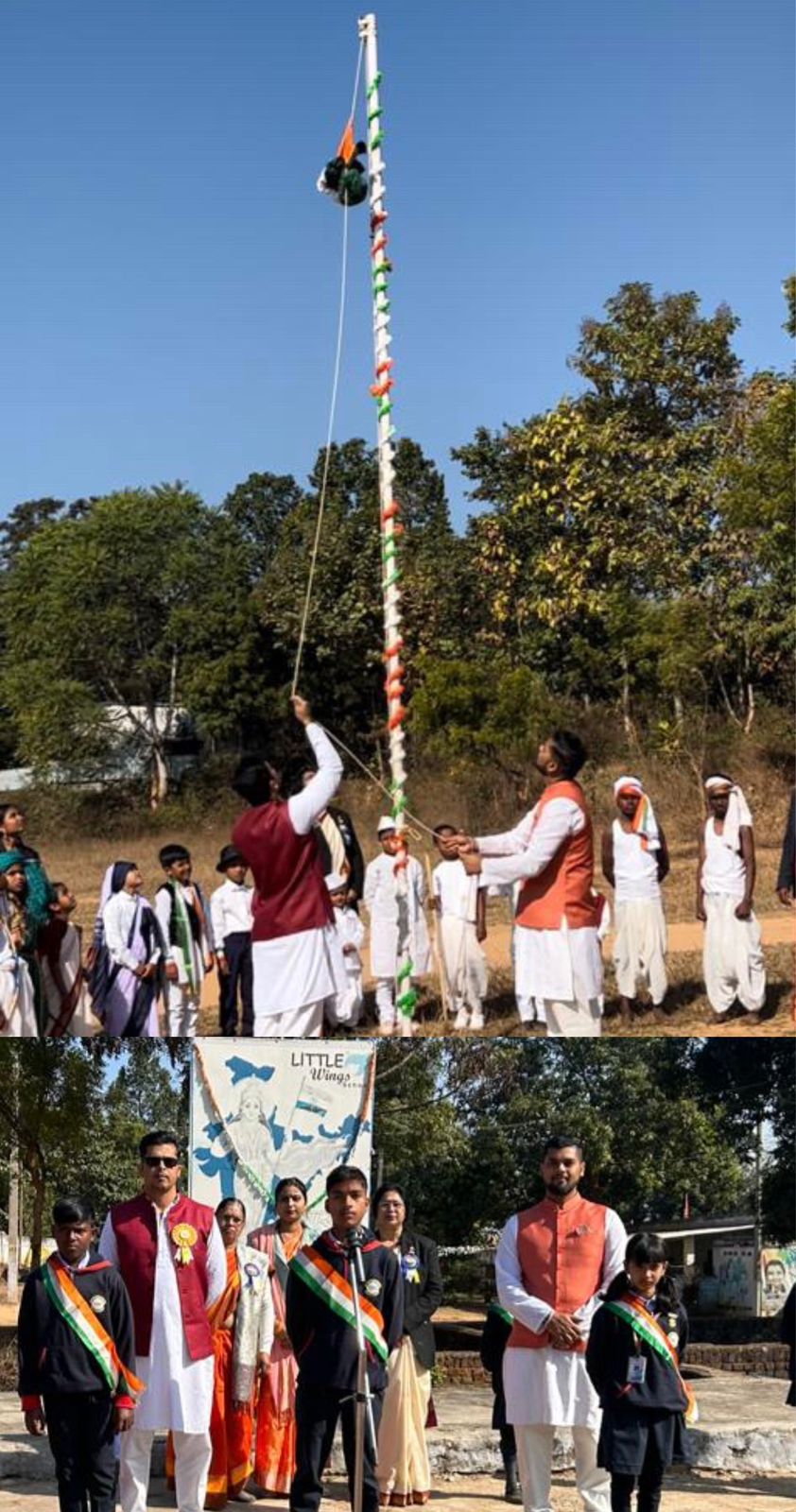 मैक्लुस्कीगंज 26 जनवरी 2024 फ़ोटो - झंडोत्तोलन करते संस्थापक व प्रबन्ध निदेशक. मैक्लुस्कीगंज स्थित लिटिल विंग्स विद्यालय में 75 वां गणतंत्र दिवस बहुत ही धूम धाम से हर्षोल्लास के साथ मनाया गया. शुरुआत विद्यालय के प्रबंधक रवि गिरि, सह संस्थापक व प्रबंधन निर्देशक ऋषि गिरि ने संयुक्त रूप से झंडोतोलन कर किया. इस अवसर पर कार्यक्रम आयोजित किया गया. जिसमे विद्यालय के बच्चों ने बढ़ चढ़ कर भाग लिया, कुछ चाचा नेहरू जी, तो कोई रानी लक्ष्मी बाई, मदर ऑफ द नेशन मदर टेरेसा, चंद्र शेखर आजाद, भगत सिंह बने और गगनभेदी नारे लगा लागये. देशभगती गानो से स्कूल के सभी बच्चे, शिक्षक व अभिभावक खूब आनन्द उठाया. वहीं प्रधानाध्यापिका सोमा मुखर्जी ने गणतंत्र दिवस के बारे मे बच्चों को बताया.