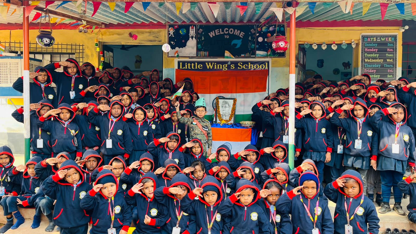 मैक्लुस्कीगंज 24 जनवरी 2024 फ़ोटो 2 - जयंती मनाते लिटिल विंग्स के छात्र व शिक्षक. लिटिल विंग्स विद्यालय हेसालौंग में नेताजी सुभाष चन्द्र बोस जयंती पराक्रम दिवस के रूप में धूम धाम से मनाया गया. कार्यक्रम की शुरुआत विद्यालय के संस्थापक रवि गिरी व प्रबन्धन निदेशक ऋषि गिरी ने संयुक्त रूप से दीप प्रज्ज्वलित व पुष्प अर्पित कर किया. विद्यालय कि प्रधानाध्यापिका सोमा मुखर्जी ने नेताजी के जीवनी व गाथायें पर प्रकाश डाला व उनके आदर्शों का अनुशरण की बात कही. उन्होंने बताया कि नेताजी सुभाष चन्द्र बोस जी कि जयंती को अधिकारिक तौर पर पराक्रम दिवस के रूप मे जाना जाता है. इस अवसर पर विद्यालय की शिक्षका नामिता, हेमंती, किशोरी खेस, आरती कुमारी, निशा, मोली सहित अन्य शामिल थे.