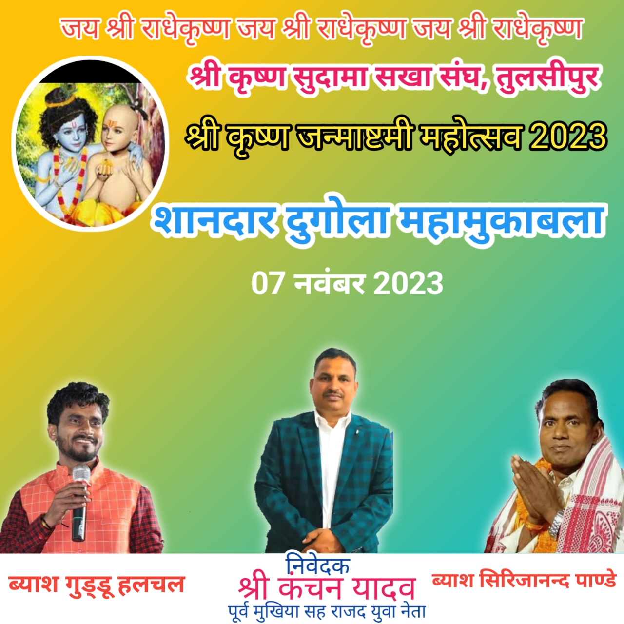 श्री कृष्ण जन्माष्टमी की तैयारी जोरों पर अशोक अनन्त, हंटरगंज(चतरा) श्री कृष्ण जन्मोत्सव को लेकर ग्राम तुलसीपुर श्री राधेकृष्ण मंदिर परिसर बथान मे श्री कृष्ण सुदामा सखा संघ के तत्वावधान मे श्री कृष्ण जन्मोत्सव सह सांस्कृतिक कार्यक्रम की तैयारी चल रही है। दिनांक 7 सितंबर दिन गुरुवार को भगवान कृष्ण का जन्मोत्सव मनाया जाना है । इस अवसर पर सांस्कृतिक कार्यक्रम शानदार दुगोला महामुकाबला का भी आयोजन किया गया है जिसमे बिहार बलिया के सुप्रसिद्ध कलाकार ब्याश गुड्डू हलचल बनाम ब्याश सिरिजानन्द पाण्डेय का आगमन हो रहा है। तुलसीपुर मे श्री कृष्ण जन्मोत्सव भव्य रूप मे होता रहा है जिसके आयोजन मे मुखिया श्री कंचन यादव का निरंतर मुख्य भूमिका रहा है। इस कार्यक्रम के सफल आयोजन को लेकर पूर्व मुखिया श्री कंचन यादव के आदेशानुसार कमिटी का पूर्ण गठन कर सभी को पदभार दिया गया है जिसे लेकर कमिटी के सभी सदस्य व कार्यकर्ता सक्रिय भूमिका मे हैं।