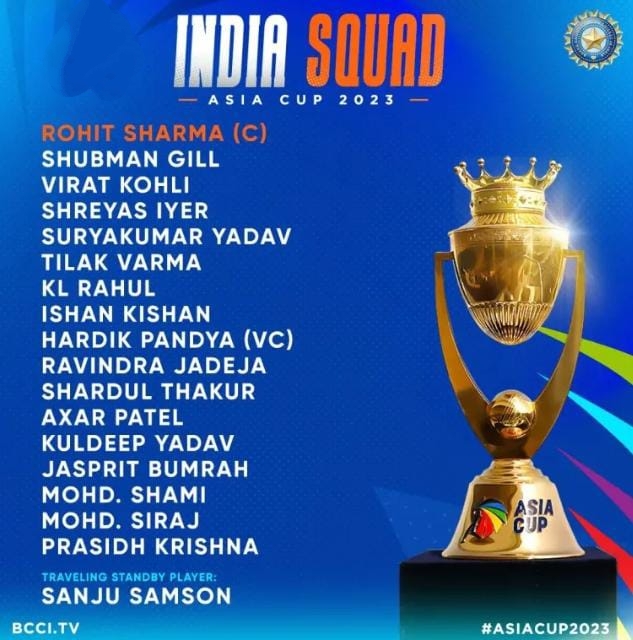 एशिया कप के लिए BCCI ने टीम इंडिया का एलान कर दिया है। बीसीसीआई ने एशिया कप के लिए अभी 17 सदस्यीय टीम का चयन किया है। बता दें कि 2023 एशिया कप का आगाज़ 30 अगस्त से होगा। टूर्नामेंट का पहला मैच पाकिस्तान और नेपाल के बीच खेला जाएगा। वहीं टीम इंडिया 2023 एशिया कप में अपना पहला मैच पाकिस्तान के खिलाफ 2 सितंबर को खेलेगी। वहीं एशिया कप का फाइनल मुकाबला 17 सितंबर को खेला जाना है।