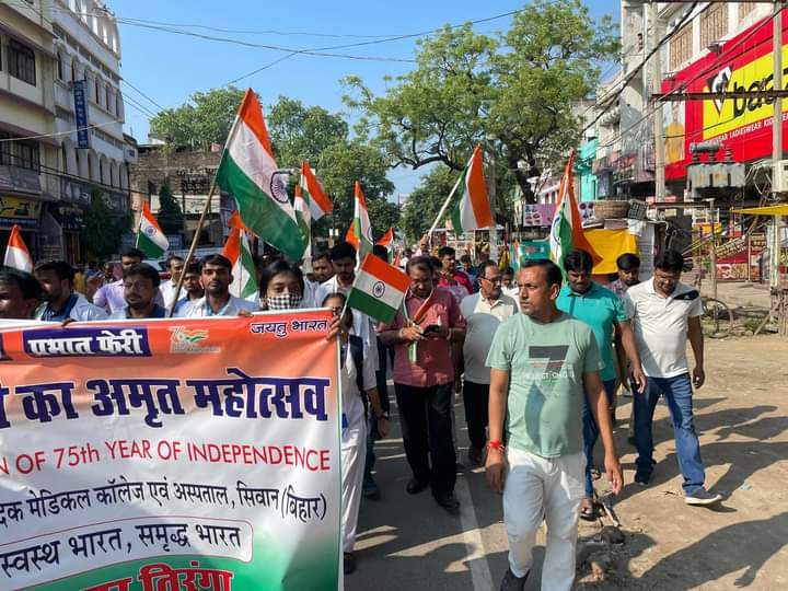 आजादी के अमृत महोत्सव के तहत दयानंद आयुर्वेदिक कॉलेज के द्वारा निकली विशाल तिरंगा रैली हुसैनगंज प्रखंड क्षेत्र के दयानंद आयुर्वेदिक मेडिकल कॉलेज के तत्वाधान में आज आजादी के अमृत महोत्सव के तहत एक विशाल तिरंगा रैली निकाली गई जिसमें छात्र छात्राएं शिक्षक गणों की उपस्थिति रही वहीं इस मौके पर प्राचार्य प्रजापति त्रिपाठी ने बताया कि तिरंगा रैली जेपी चौक चौक तक पहुंची जहां पर हजारों छात्र-छात्राएं व शिक्षक गण मौजूद रहे वहीं इस तिरंगा रैली का मुख्य उद्देश्य स्वतंत्रा दिवस आजादी का अमृत उत्सव मनाना है तथा सभी को सेलिब्रेट करना है।