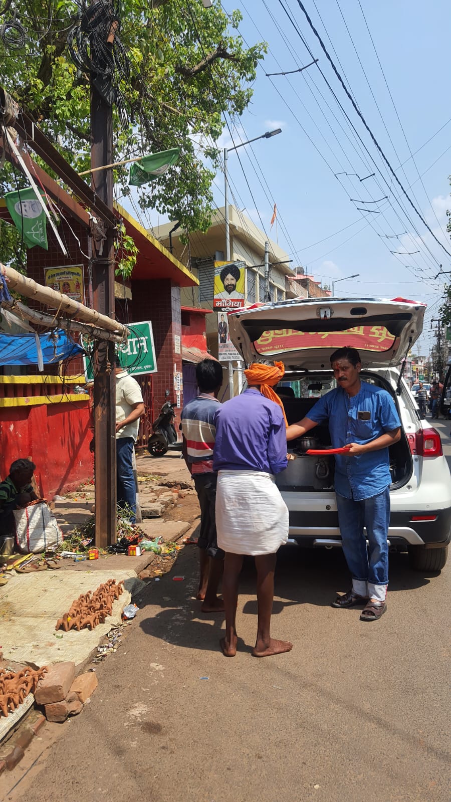दोपहर लू में भी आज राजमा,चावल,चिप्स, आचार का भोजन अध्यक्ष राजेश कुमार राउत के घर से स्वनिर्मित भोजन,शहर के टाटा शोरूम, टीन बाजार, धर्म स्थान,वीर कुंवर सिंह चौक, रसिकपुर, s.p. काॅलेज रोड,शिव पहाड़, पोखरा चौक इत्यादि जगहों पर कार से घूम घूम कर लगभग 150 लोगों को भोजन कराया गया। आज खानें वालों की संख्या ज्यादा होने के कारण ब्लाइंड हास्टल नहीं जा पाया। आज सही में कुछ विछिप्तों को खाना खिला कर मन को बहुत संतुष्टि मिला ।