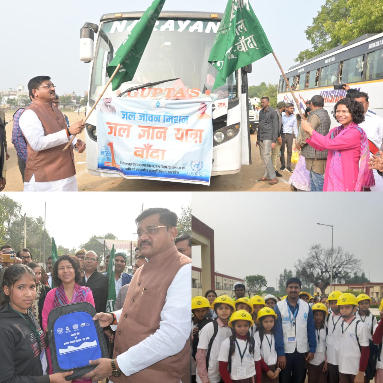 *जल से है बेहतर कल, जल ज्ञान यात्रा से सीखे नौनिहाल* - बांदा में नमामि गंगे एवं ग्रामीण जलापूर्ति विभाग की अनूठी पहल जल ज्ञान यात्रा का आयोजन - जल शक्ति राज्य मंत्री रामकेश निषाद एवं जिलाधिकारी दुर्गा शक्ति नागपाल ने जल ज्ञान यात्रा को दिखाई हरी झण्डी - सरकारी स्कूलों के बच्चों को जल जीवन मिशन की हर घर जल योजना की दी गई जानकारी - स्कूली बच्चों ने देखी कमासिन विकास खण्ड के किटहाई स्थित खटान ग्राम समूह पाइप पेयजल परियोजना - जल गुणवत्ता जांच की उपयोगिता समझी, जल जागरूकता पर आधारित कार्यक्रमों में लिया भाग *बांदा। 6 दिसम्बर* महर्षि वामदेव की तपोभूमि कहे जाने वाले बांदा जिले में छात्रों के लिए गुरुवार का दिन बेहद खास रहा। सरकारी स्कूलों के सैकड़ों छात्रों को नमामि गंगे एवं ग्रामीण जलापूर्ति विभाग की अनूठी पहल ''जल ज्ञान यात्रा' से जुड़ने का मौका मिला। जल जागरूकता के लिए निकाली गई यात्रा में बच्चों ने जल के जीवन में महत्व और उसकी उपयोगिता समझी। नौनिहालों ने जल जीवन मिशन की हर घर जल योजना से ग्रामीण परिवारों तक पहुंचाई जा रही शुद्ध पेयजल सप्लाई की परियोजना देखी। इस दौरान वाटर ट्रीटमेंट प्लांट का नजारा स्कूली बच्चों के लिए बेहतरीन अनुभव रहा। जल जागरूकता कार्यक्रमों में भाग लेते हुए छात्रों ने एफटीके किट से पानी की जांच भी देखी। यह पहला मौका था जब बांदा के स्कूली बच्चों को जल जीवन मिशन की 'हर घर जल' योजना को नजदीक से समझने और उसके फायदों के बारे में जानकारी मिली। 'जल ज्ञान यात्रा' का शुभारंभ जल शक्ति राज्य मंत्री रामकेश निषाद एवं जिलाधिकारी दुर्गा शक्ति नागपाल ने हरी झंडी दिखाकर जी.आई.सी. ग्राउंड से किया। यात्रा में पद्मश्री उमाशंकर पाण्डेय, ए.डी.एम. नमामि गंगे एम.पी. सिंह, अधिशासी अभियंता जल निगम (ग्रामीण) महेन्द्र राम भी मौजूद रहे। पानी की कीमत समझाने कि लिए निकाली गई यात्रा में बडोखरखुर्द विकास खण्ड की चिन्हित ग्राम पंचायतों के अंतर्गत 10 उच्च प्राथमिक विद्यालयों के सैकड़ों छात्र शामिल हुए। यहां उन्हें जल जांच की प्रक्रिया दिखाने के साथ ही भूजल उपचार और अन्य संबंधित मुद्दों की जानकारी दी गई। छात्रों को सबसे पहले कमासिन विकास खण्ड के किटहाई स्थित खटान ग्राम समूह पाइप पेयजल परियोजना ले जाया गया और वाटर ट्रीटमेंट प्लांट, जलाशय, पंप हाउस की कार्यप्रणाणी की जानकारी दी गई। फील्ड टेस्ट किट प्रशिक्षित महिलाओं ने स्कूली बच्चों को जल गुणवत्ता की जांच करके दिखाई। स्कूली बच्चों के लिए जल जागरूकता पर आधारित क्विज प्रतियोगिता का आयोजन वाटर ट्रीटमेंट प्लांट पर ही किया गया। इसके साथ ही नुक्कड़-नाटक व मैजिक शो के अलावा हैंडवाश से होने वाले बचाव की जानकारी भी बच्चों को दी गई। इस दौरान छात्र- छ