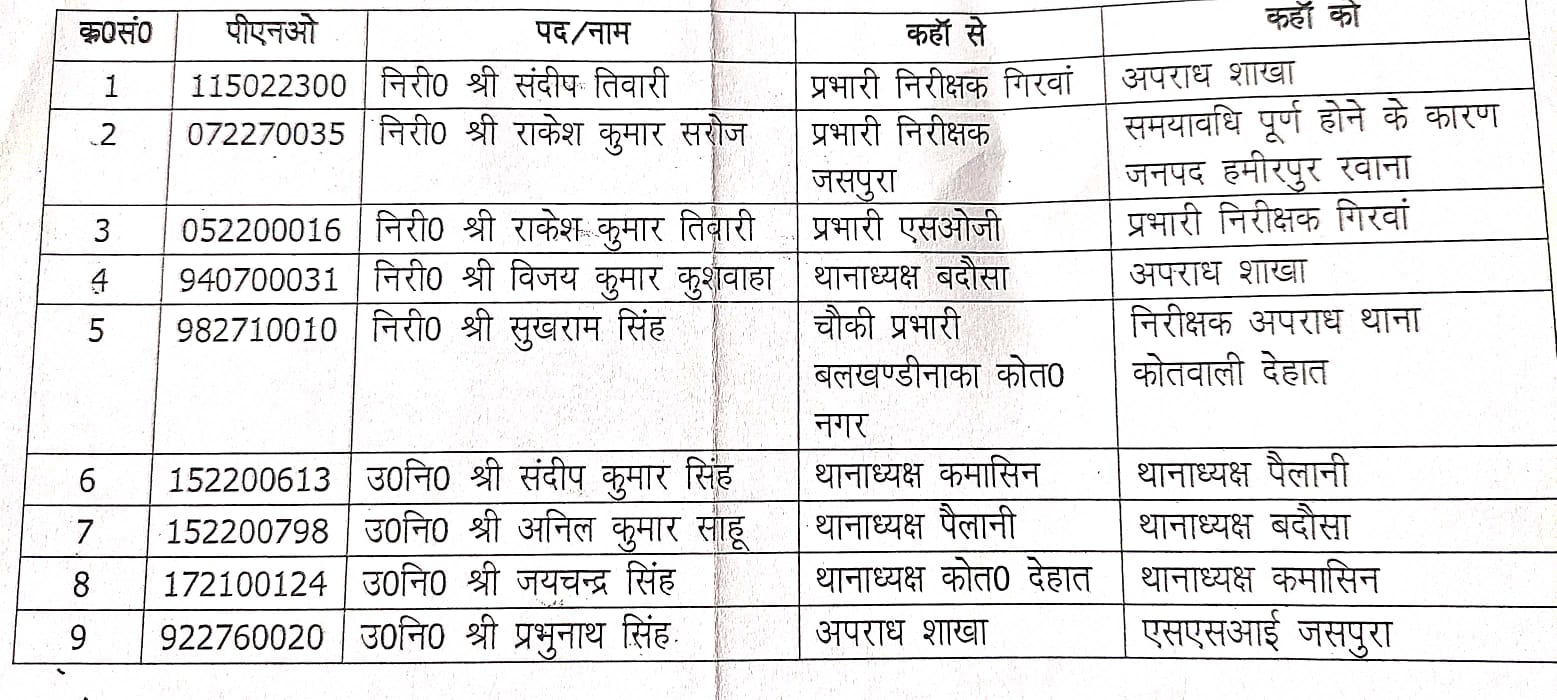 बाँदा:-एसपी अंकुर अग्रवाल की चली तबादला एक्सप्रेस,5 निरीक्षक व 4 उप निरीक्षकों का किया स्थानांतरण,बढ़ते अपराधों व गैरकानूनी गतिविधियों पर लगाम लगाने के लिए किए गए तबादले, 1:-एसओजी प्रभारी राकेश कुमार तिवारी को प्रभारी निरीक्षक गिरवा 2:- प्रभारी निरीक्षक जसपुरा राकेश कुमार सरोज को समयावधि पूर्ण होने के कारण जनपद हमीरपुर 3:- प्रभारी निरीक्षक गिरवा संदीप तिवारी को अपराध शाखा 4:- थाना अध्यक्ष बदौसा विजय कुमार कुशवाहा को अपराध शाखा 5:- चौकी प्रभारी बनखंडी नाका सुखराम सिंह को निरीक्षक अपराध देहात कोतवाली 6:-थाना अध्यक्ष कमासिन उप निरीक्षक संदीप कुमार सिंह को थाना अध्यक्ष पैलानी 7:- थाना अध्यक्ष पैलानी उपनिरीक्षक अनिल कुमार साहू थाना अध्यक्ष बदौसा 8:- थाना अध्यक्ष कोतवाली देहात उप निरीक्षक जयचंद सिंह थाना कमासिन 9:-अपराध शाखा उपनिरीक्षक प्रभु नाथ सिंह एसएसआई जसपुरा