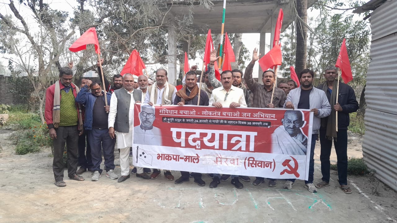 बिहार के सिवान जिले की मैरवा की रिपोर्ट: मैरवा: महात्मा गांधी के शहादत दिवस पर मैरवा में माले नेताओ ने पदयात्रा निकाला। नगर के मेन रोड स्तिथ खादी भंडार में गांधी जी के प्रतिमा पर माले नेताओ ने माल्यार्पण किया। 24 जनवरी को कर्पूरी ठाकुर के जयंती पर शुरू हुआ संविधान बचाओ लोकतंत्र बचाओ जन अभियान 30 जनवरी को गांधी जी के शहादत दिवस पर समाप्त हो गया। इस दौरान माले नेता उपेंद्र साह ने कहा कि महात्मा गांधी के आदर्शों को भी याद करने का दिन है। जिसकी बदौलत उन्होंने बिना हथियार उठाए अंग्रेजों को भारत से बाहर खदेड़ दिया था। उनके विचार ही उनकी आक्रमण और ढाल दोनों थे। एक पंक्ति के जरिए उनके इस शौर्य का गुणगान भी किया गया। पदयात्रा में प्रखंड सचिव मुकेश कुशवाहा, पूर्व मुखिया योगेंद्र कुशवाहा, माले नेता जयराम यादव, माले नेता सुरेंद्र शर्मा, माले नेता इस्तिहाक अंसारी, माले नेता जीशु अंसारी, माले नेता महताब आलम सहित सैकड़ों लोग शामिल थे।