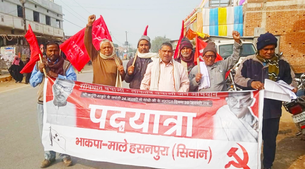 बिहार के सिवान जिला से हसनपुरा की रिपोर्ट: हसनपुरा में संविधान बचाओ, लोकतंत्र बचाओ जन अभियान के तहत प्रखंड सचिव उमेश प्रसाद के नेतृत्व में मंगलवार को पदयात्रा निकाला गया। यह पदयात्रा कर्पूरी ठाकुर जयंती से गांधीजी के शहादत दिवस तक संकल्प यात्रा नगर पंचायत के उसरी, अरंडा होते हुए मुख्य मार्ग हसनपुरा के रास्ते प्रखंड मुख्यालय तक निकाला गया।