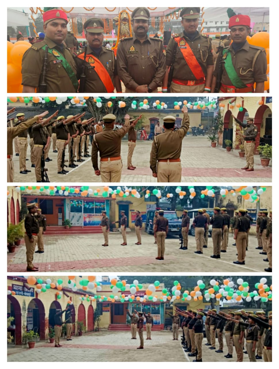 गणतंत्र दिवस पर खजनी थाने में ध्वजारोहण के साथ सामूहिक शपथ और परेड की गई। खजनी गोरखपुर।। गणतंत्र दिवस के अवसर पर आज खजनी थाने में थानाध्यक्ष गौरव आर कन्नौजिया के साथ थाने के सभी पुलिसकर्मियों ने राष्ट्रीय ध्वज तिरंगा फहराते हुए सलामी दी गई, और सामूहिक राष्ट्रगान में सभी ने हिस्सा लिया। इस अवसर पर थाना परिसर में सामूहिक परेड हुई और शपथ भी ली गई। थानाध्यक्ष गौरव आर कन्नौजिया के नेतृत्व में आयोजित हुए राष्ट्रभक्ति से ओतप्रोत कार्यक्रम में थाने के सभी पुलिसकर्मी उत्साह पूर्वक सम्मिलित हुए।
