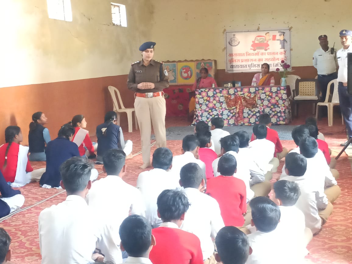 पुलिस मुख्यालय द्वारा चलाए जा रहे विशेष अभियान के तहत चार पहिया वाहन चालकों को सीट बेल्ट एवं दो पहिया वाहन चालकों को हेलमेट धारण करने हेतु जागरुकता अभियान चलाया जा रहा है जिसके पालन में श्रीमान पुलिस अधीक्षक पन्ना श्री साई कृष्णा एस थोटा एंव अतिरिक्त पुलिस अधीक्षक पन्ना श्रीमति आरती सिंह एवं अनुविभागीय अधिकारी एस.पी.सिंह बघेल के निर्देशानुसार थाना प्रभारी यातायात निरीक्षक नीलम लक्षकार व यातायात पुलिस द्वारा सरस्वती हायर सेकेंडरी स्कूल पन्ना पन्ना के छात्र एवं छात्राएं के बीच जागरुकता कार्यक्रम आयोजित किया गया । जिसमें बच्चों को ट्राफिक सिग्नल ,रोड़ साइन ,रोड मार्किंग,एक्सीडेण्ट के कारण, बचाव हेतु सावधानियाँ, राइट आफ वे, एमरजेंसी केयर, गुड सेमेरिटन (नेक व्यक्ति) योजना के विषय में विस्तृत जानकारी दी गई । बच्चों को रोड पर पैदल चलते समय या रोड क्रास करते समय क्या सावधानियाँ रखनी चाहिए । साइकिल चलाते समय किन बातों का ध्यान रखना चाहिए साथ ही ड्राइविंग लाईसेंस बनवाने की प्रकिया आदि बिन्दुओं पर बच्चों के बीच चर्चा की गई । इसके अतिरिक्त छतरपुर - पन्ना वायपास रोड़ पर वाहन चैकिंग चालानी कार्यवाही की गयी जिसमें यातायात नियमों का उल्लघंन करने वाले कुल 20 वाहन चालकों के विरुद्ध चालानी कार्यवाही कर 7000 रूपये समन शुल्क बसूल किया गया । जागरुकता कार्यक्रम के दौरान थाना प्रभारी यातायात निरीक्षक नीलम लक्षकार, महेश तिवारी, कमलेश सिंह, नफीस मोहम्मद, अमन यादव, सत्येन्द्र सिंह सहित सरस्वती हायर सेकेंडरी स्कूल पन्ना पन्ना का समस्त स्टाप व छात्र, छात्राएं उपस्थित रहे
