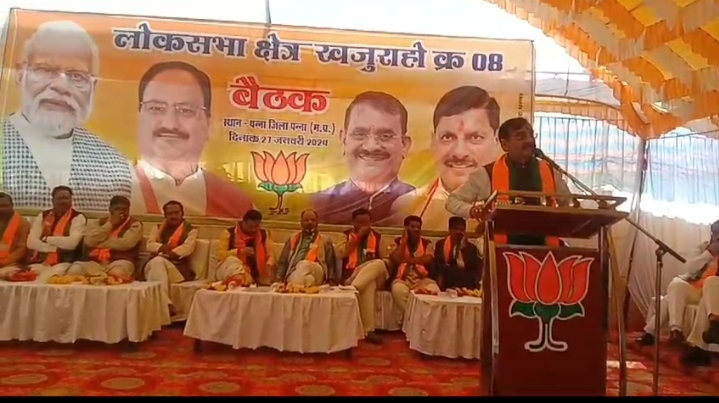 भारतीय जनता पार्टी की क्लस्टर बैठक पन्ना नगर के एवरशाइन गार्डन में संपन्न हुई जहां सांसद बीडी शर्मा और क्लस्टर प्रभारी भूपेंद्र सिंह सहित कई भाजपा नेता पदाधिकारी और कार्यकर्ता भी शामिल हुए। इस अवसर पर विधानसभा चुनाव के दौरान भाजपा को ऐतिहासिक जीत दिलाने वाले कार्यकर्ताओं को सम्मानित किया गया एवं बूथ स्तर पर भाजपा को मजबूत करने के लिए कार्यकर्ताओं को रणनीति के बारे में अवगत कराया गया। कार्यक्रम उपरांत भाजपा प्रदेश अध्यक्ष एवं खजुराहो सांसद विष्णु दत्त शर्मा ने मीडिया से मुखातिब होते हुए बताया कि विधानसभा चुनाव के दौरान भाजपा की हुई ऐतिहासिक जीत का श्रेय कार्यकर्ताओं को जाता है। इसके साथ ही मध्य प्रदेश के मन में मोदी है और लोकसभा चुनाव के दौरान इस बार भाजपा देश में रिकॉर्ड बनाएगी और खजुराहो लोकसभा चुनाव में नंबर वन आएगी। इसके साथ ही उन्होंने बताया कि भाजपा का अभियान प्रत्येक बूथ में 10% मत बढ़ाना और अपना बूथ मजबूत बनाना है। कांग्रेस प्रभारी संजय यादव के द्वारा सांसद निधि के उपयोग के संबंध में लगाए गए आरोपों के बारे में पूछने पर सांसद श्री शर्मा बौखला गए और कांग्रेस प्रभारी को मूर्ख बताया