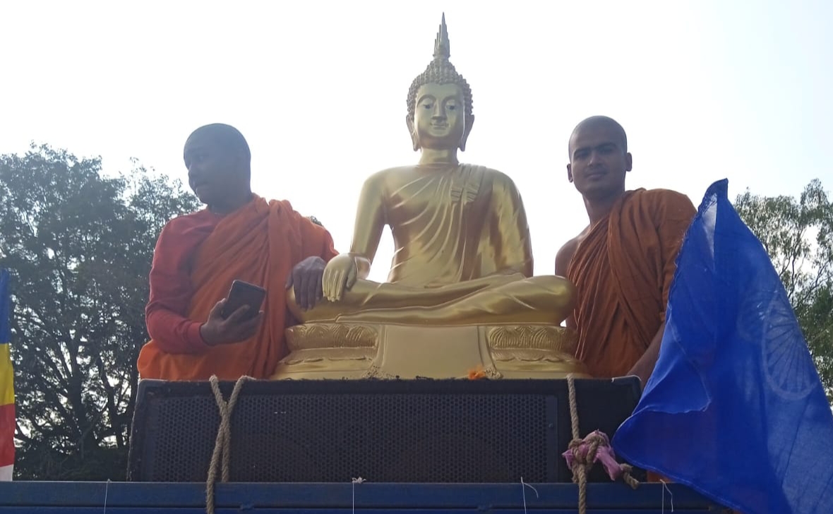 शोभा यात्रा के बाद बुद्ध विहार कालापाठा में हुआ प्रतिमा का अनावरण बैतूल। आम्रपाली महिला मंडल एवं बुद्ध विहार प्रबंधन समिति के संयुक्त प्रयास एवं सामाजिक संगठन के सहयोग से तथागत बुद्ध की अष्टधातु निर्मित प्रतिमा थाईलैंड से बैतूल पहुंची। यह प्रतिमा आयुष्मति पुष्पा नागले ने स्मृति शेष पति पंजाबराव नागले (डिप्टी कलेक्टर) की स्मृति में बुद्ध विहार कालापाठा को दान दी। प्रतिमा अनावरण कार्यक्रम भंते सारिपुत्र, भंते दीपांकर, भंते शिलानंद, भंते रतन बोधी, भंते धम्मपाल एवं अन्य पूजनीय भिक्कू संघ के द्वारा की गई। बुद्ध प्रतिमा की अगवानी के बाद पुष्पा नागले के निवास से 11 बजे शोभायात्रा निकाली गई। शोभायात्रा डॉ.बाबासाहेब आंबेडकर चौक पहुंची जहां पर समाज के समस्त सामाजिक संगठनों ने पुष्प वर्षा कर शोभायात्रा एवं भिक्कू संघ का स्वागत किया। इसके बाद बुद्ध वंदना त्रिशरण पंचशील का पाठ कर शोभायात्रा वापस बुद्ध विहार कालापाठा पहुंची। कालापाठा बुद्ध विहार में प्रतिमा अनावरण कार्यक्रम भिक्कू संघ द्वारा संपन्न किया गया।