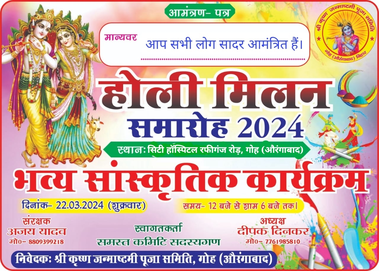 श्रीकृष्ण जन्माष्टमी पूजा समिति के तत्वावधान में आयोजित होली मिलन समारोह की तैयारियां पूरी कर ली गई है। संयोजक अजय यादव ने बताया कि होली मिलन समारोह के लिए पूजा समिति द्वारा तुलसी बिगहा में भव्य तैयारी की गई थी लेकिन अचानक हुई बारिश ने खलल डाल दिया। विस्तार पूर्वक जानकारी के लिए क्लिक करें ऑडियो पर और सुनें पूरी खबर।