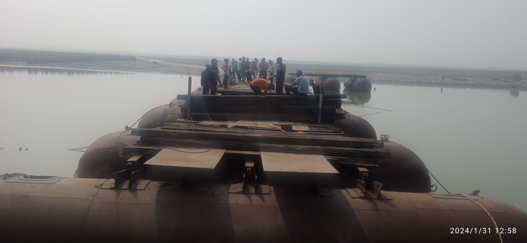 कोलकाता से वाया खरीद-दरौली घाट से अयोध्या गए जहाजों के वापसी में विलम्ब के मद्देनजर खरीद घाट पर खोले गए पैंटून ब्रिज के पीपों को तेजी से जोड़ने का कार्य शुरू हो गया है। पीपों को जोड़ने का जिस तेजी से कम हो रहा है उससे अंदाजा लग रहा है कि गुरुवार को किसी समय पीपा पुल पर गमनागमन शुरू हो जाएगा। पुल पर पैदल के साथ ही दोपहिया और चार पहिया वाहन भी आवागमन कर सकेंगे। अयोध्या में 22 जनवरी को श्रीराम मन्दिर में प्राण प्रतिष्ठा के कार्यक्रम के दौरान कोलकाता से अयोध्या तक घोषित जलमार्ग पर जहाज के संचालन हेतु उद्घाटन हुआ था। जिसके लिए कोलकाता आये दो जलयानों के गुजरने हेतु पीपा पुल के दो जुट पीपों को खोला गया था। पीपों को जोड़ने के लिए आदेश आने में विलम्ब के और नागरिकों के बिहार यूपी आवागमन में परेशानी के मद्देनजर लो.निर्माण विभाग के पुल को जोड़ने का कार्य चल रहा है।