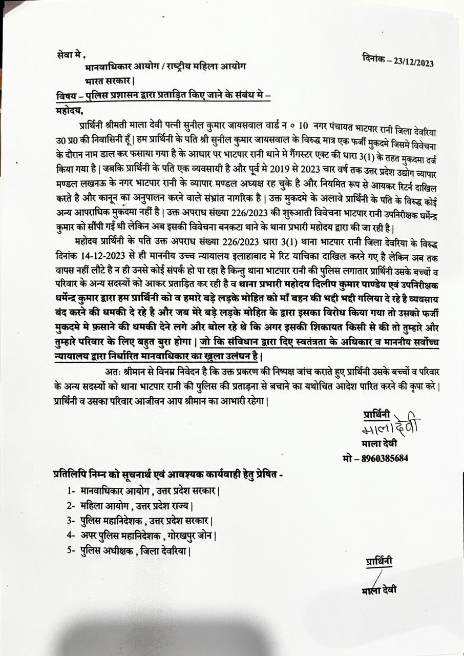 भाटपार रानी,देवरिया। नगर के वार्ड नंबर 10 की महिला माला देवी ने शनिवार को राष्ट्रीय महिला आयोग एवं मानव अधिकार आयोग को पत्र भेज कर न्याय की गुहार लगाई है। उन्होंने बताया कि उनके पति सुनील जायसवाल नगर व्यापार मंडल के अध्यक्ष रहे हैं तथा एक सामाजिक व्यक्ति हैं। स्थानीय पुलिस ने फर्जी ढंग से उन्हें गैंगस्टर एक्ट में फंसा दिया है। जबकि उनके विरुद्ध मात्र एक मुकदमा थाने में दर्ज है।