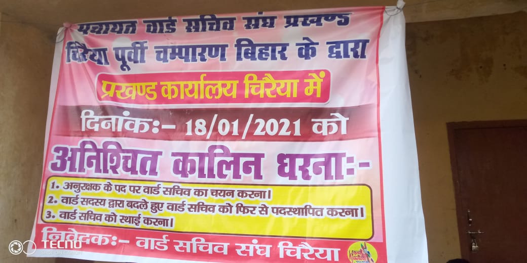 पूर्वी चम्पारण जिले के चिरैया प्रखंड कार्यालय में पंचायत वार्ड सचिव संघ के द्वारा तीन सूत्रीय मांगों को लेकर आज से अनिश्चितकालीन धरना पर बैठे है। उनलोगों का कहना है कि अनुरक्षक के पद पर वार्ड सचिव को चयन करना वार्ड सदस्य द्वारा बदले हुए वार्ड सचिव को फिर से पदस्थापित करना वार्ड सचिव को स्थाई करना।