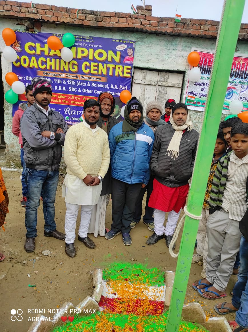 पूर्वी चम्पारण जिले के पताही प्रखंड क्षेत्र में 72 वीं गणतंत्र दिवस चैंपियन कोचिंग सेंटर, ढंगरटोली चौक नोनफरवा के द्वारा बहुत शांतिपूर्ण और खूब धूमधाम से मनाया गया,जिसमे सैकड़ो के संख्या में विद्यार्थियों एवं गार्जियन गन उपस्थित रहे।इस मौके पर उपस्थित युवा मोर्चा के महामंत्री- सह-चैंपियन कोचिंग के डायरेक्टर-रवि सर, पूर्व मुखिया-अभय तिवारी, राजू तिवारी, अशोक सिंह, संजय सिंह,प्रहलाद बैठा, प्रशांत बैठा, राजन कुमार, अविषेक कुमार, विशाल कुमार, गोलू कुमार,आलोक कुमार, पूजा कुमारी,नीरज कुमार,नितेश कुमार, खुशबू कुमारी, सोनी कुमारी, अंशु कुमारी, उपस्थित थे।