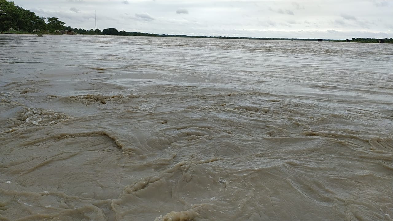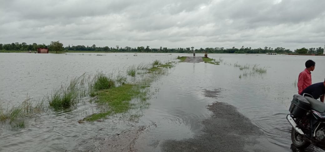 सिकटा गाँव के समीप सरक पा बह रहा बाढ़ का पानी।