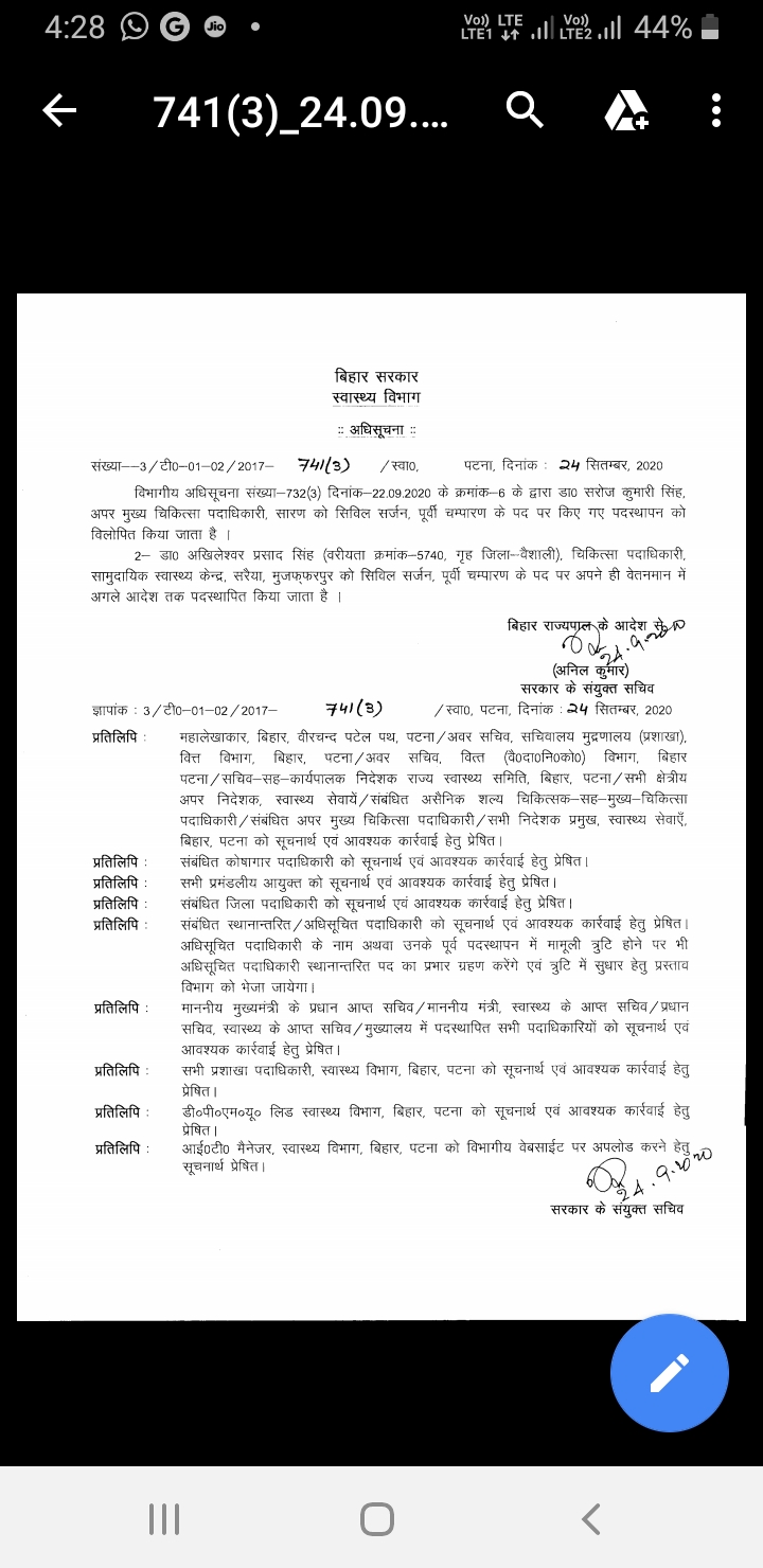 पूर्वी चम्पारण के सिविल सर्जन सरोज कुमारी सिंह हटा कर डॉ. अखिलेश्वर प्रसाद सिंह को पूर्वी चम्पारण का बनाया गया सिविल सर्जन।
