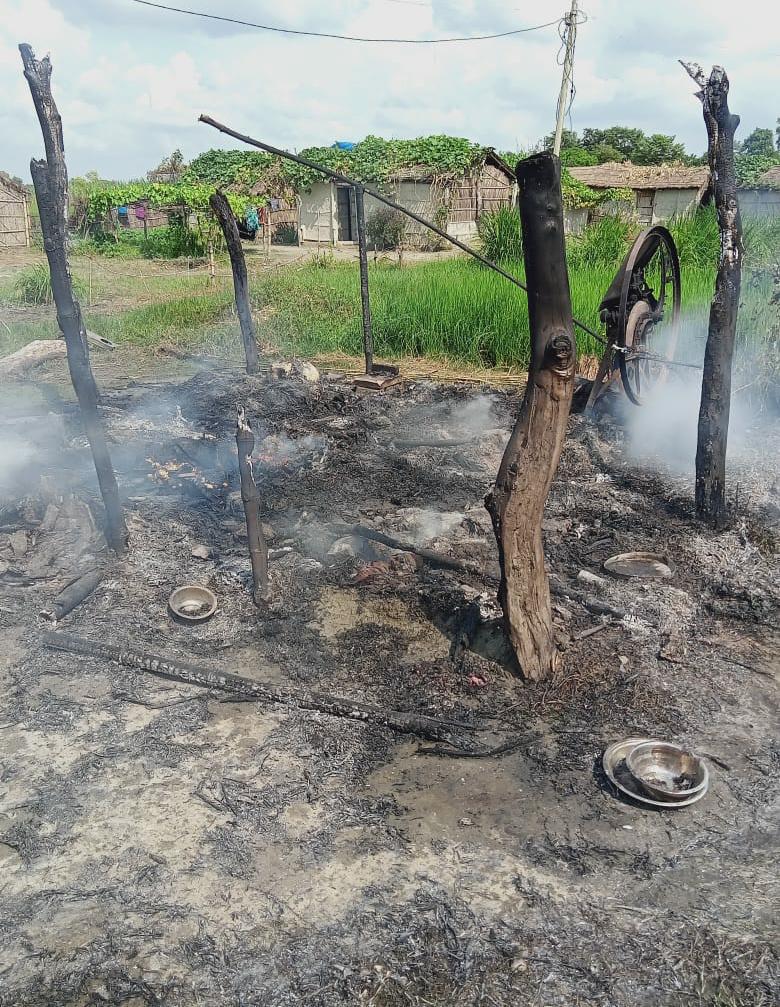 बगहा प्रखंड एक के पंचायत राज बीबी बनकटवा के वार्ड संख्या 01 निवासी जवाहर बिन पिता सरल बिन के घर में करीब 11 ,बजे अचानक आग लग गई। आग इतनी तेज थी कि पल भर मेंं ही लाखो का सामान जलकर राख हो गया। पीड़ित परिवार के सामने रोजी रोटी और छत का संकट खड़ा हो गया है। कपड़ा, बिस्तर, चारपाई, राशन व अन्य सामान जलकर राख हो गया।जवाहर बिन गाँव में ही मजदूरी करने गए थे, घर पर उनकी पत्नी माला थी।अचानक फूस की घर से धुंआ निकलता देख पत्नी ने शोर मचाया तब तक आग धधक उठी।आग इतनी तेज थी कि जवाहर बिन की पत्नी ने किसी तरह से उसने अपनी और अपने बच्चों की जान बचाई। ग्रामीणों ने किसी तरह आग को काबू में किया।इस आग में लाखो का सामान जलकर खाक हो गया। अभी तक सरकार के तरफ से सहायता नही मिल पाया है।इस खबर को सुनने के लिए ऑडियो पर क्लिक करें।