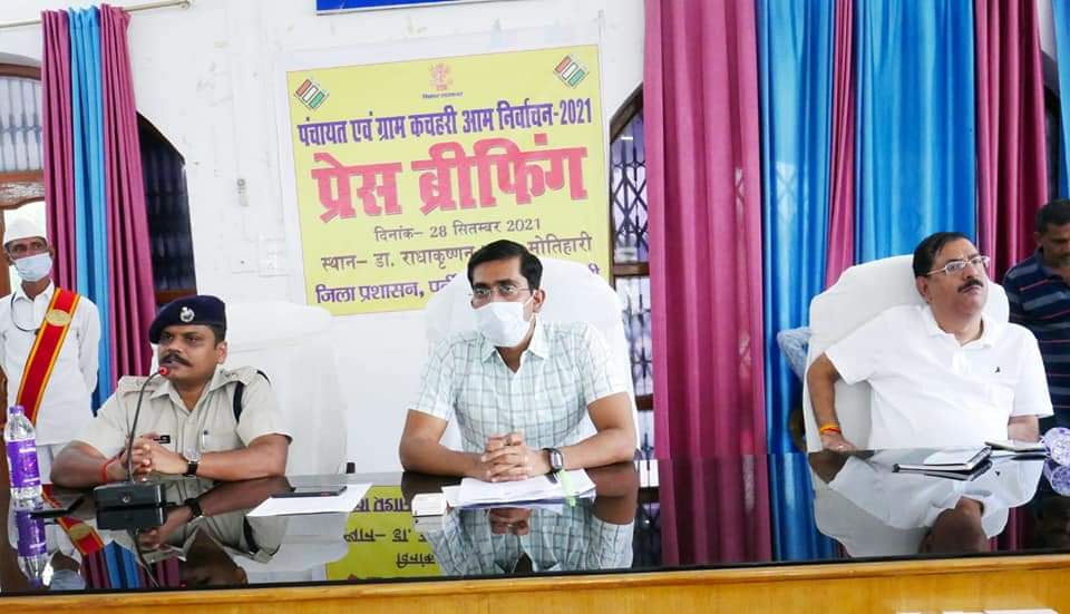 मोतिहारी:- "पंचायत आम निर्वाचन 2021 को ले जिला निर्वाचन पदाधिकारी (पंचयात) -सह- जिलाधिकारी श्री शीर्षत कपिल अशोक एवं पुलिस अधीक्षक श्री नवीन चंद्र झा ने संयुक्त रूप से समाहरणालय सभागार राधाकृष्णन भवन में प्रिंट एवं इलेक्ट्रॉनिक मीडिया के संवाददाताओं के साथ की प्रेस वार्ता