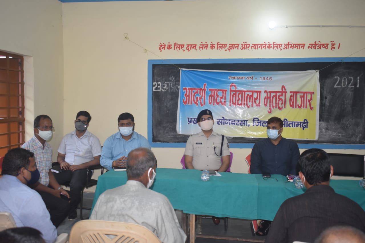 डीएम सुनील कुमार यादव एवं एसपी हर किशोर राय ने जिले में शांति,सौहाद्र एवम भाईचारे के वातावरण में बकरीद पर्व मनाने को लेकर सोनबरसा प्रखण्ड के भूतही आदर्श मध्य विद्यालय में आयोजित शांति समिति की बैठक में भाग लिया। जिला पदाधिकारी द्वारा शांति समिति की बैठक में उपस्थित लोगों से अपील किया गया कि इस बार भी बकरीद पर्व सभी लोग शांति,प्रेम एवम भाईचारे के साथ अपने-अपने घरों में ही मनाए। उन्होंने यह भी अपील किया कि अपने-अपने क्षेत्रों के मस्जिदों में लगे माइक द्वारा लोगों को भी बकरीद घर में मनाने का अपील किया जाए। डीएम सुनील कुमार यादव ने बैठक में उपस्थित सभी लोगों से कोरोनावायरस का टीका लगवाने का भी अपील किया एवं बैठक में उपस्थित सभी लोगों से अपील किया कि वह अपने-अपने क्षेत्रों में जो लोग टीका नहीं लगवाए हैं उन्हें टीका लगवाने के लिए जागरूक एवम प्रेरित करें। पुलिस अधीक्षक हर किशोर राय ने कहा कि सभी लोग कोविड-19 के गाइडलाइन नियमों का अनिवार रूप से पालन करें एवं शांति एवम सौहाद्रपूर्ण वातावरण में बकरीद पर्व को मनाएं । उन्होंने कहा कि सभी प्रकार के अफवाहों से बचें। सोशल मीडिया में फैलाए जाने वाले अफवाह की खबरों पर ध्यान ना दें,साथ ही भ्रामक एवम सामाजिक समरसता को बिगाड़ने वाले पोस्ट की जानकारी जिला नियंत्रण कक्ष के दूरभाष नंबर 06226-250316 एवम स्थानीय थानों पर जरूर दे। । उक्त बैठक में उपस्थित सभी लोगों ने सर्वसम्मति से एक स्वर में कहा की आने वाले सभी पर्व त्यौहार शांति एवम सौहाद्रपूर्ण वातावरण में मनाए जाएंगे । उन्होंने कहा कि हम सभी जिला प्रशासन द्वारा दिये गए दिशा निर्देशो का पालन करेंगे। उक्त शांति समिति की बैठक में अनुमंडल पदाधिकारी सदर राकेश कुमार, अनुमंडल पुलिस पदाधिकारी रमाकांत उपाध्याय, प्रखंड विकास पदाधिकारी ओम प्रकाश कुमार, अंचल अधिकारी,थानाध्यक्ष आदि उपस्थित थे।*