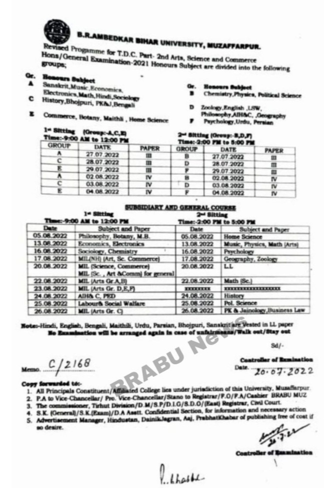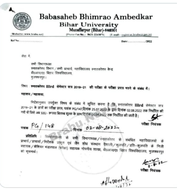 B.R.A. बिहार विश्वविद्यालय के स्नातक पार्ट 2, 2019 22 की सब्सिडरी व जनरल पेपर की परीक्षा 5 अगस्त 2022 से शुरू होगी।