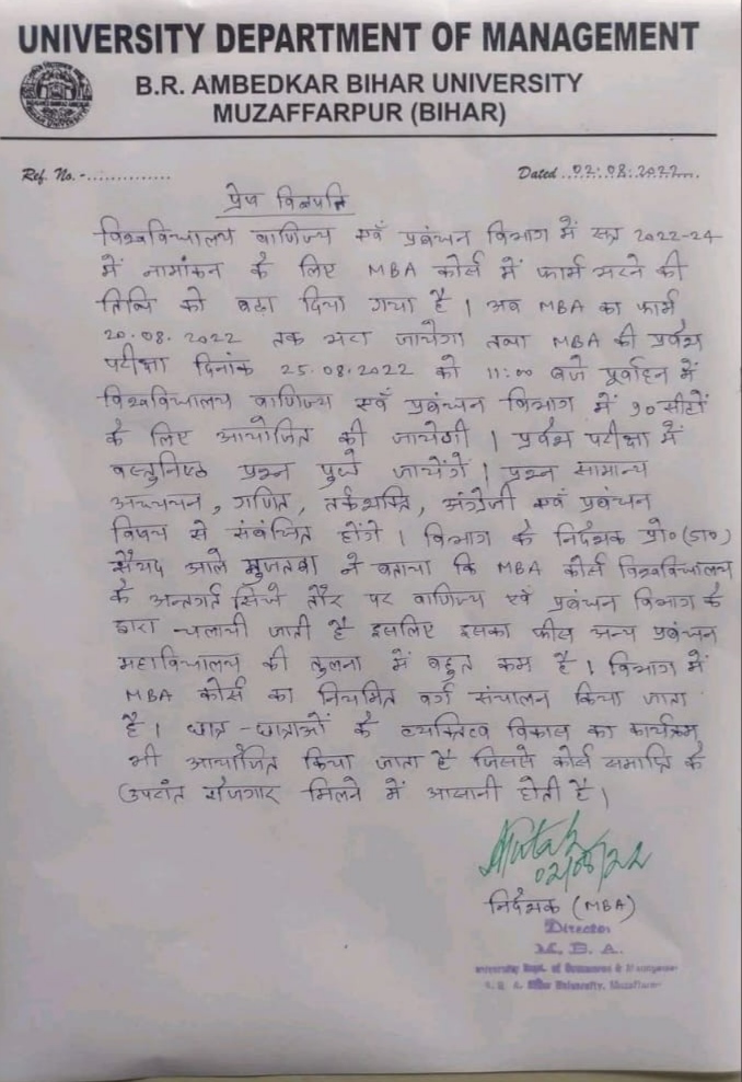 एमबीए के प्रवेश परीक्षा 25 अगस्त 2022 को 90 सीटों के लिए ली जाएगी।