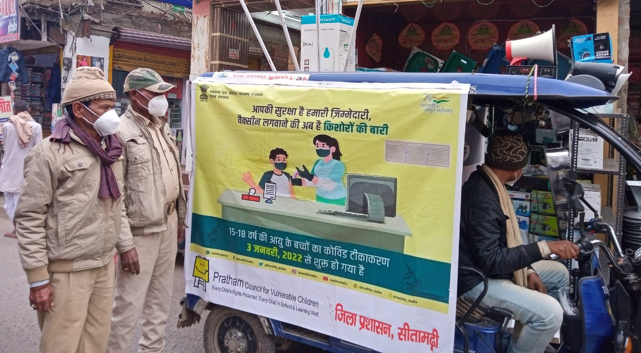 बढ़ते कोरोना संक्रमण से बचाव एवम टीकाकरण हेतु जिला प्रशासन एवम प्रथम संस्था के सहयोग से लगातार चलाई जा रही जागरूकता अभियान* *15 से 18 आयु के किशोरो के टीकाकरण को लेकर विशेष जागरूकता अभियान।* जिला पदाधिकारी सुनील कुमार यादव के निर्देश पर जिला प्रशासन और प्रथम संस्था के सहयोग से बढ़ते कोरोना संक्रमण से बचाव व टीकाकरण हेतु व्यापक जागरूकता अभियान चलाए जा रहे है। एसडीओ राकेश कुमार के नेतृत्व में शहर के पासवान चौक, बस स्टैंड, कारगिल चौक, मेहसौल चौक, किरण चौक, रेलवे स्टेशन, हॉस्पिटल रोड, बड़ी बाजार, राजोपट्टी, कोर्ट परिसर सहित विभिन्न चौक चौराहों पर माइकिंग कर के द्वारा जागरूकता अभियान चलाई गई। मास्क पहनने, सामाजिक दूरी का पालन करने, भीड़-भाड़ वाले जगह से बचने और 15 वर्ष से अधिक आयु के लोगों से टीकाकरण करवाने की अपील की जा रही है। एसडीओ श्री कुमार ने बताया कि अधिक से अधिक लोगो तक पहुँच हो, और लोग भी इसे संवेदनशीलता के साथ अपने हाथ में ले। आदर्श और जिम्मेवार नागरिक की तरह स्वयं भी संक्रमण से बचे और दूसरे को भी बचाने में सेवा भाव से मदद करे। अभियान में मास्क का वितरण भी की गई। दो गज की दूरी - मास्क है जरूरी, अभियान में प्रथम संस्था के सुधीर कुमार, बिरेन्द्र कुमार , अमित आदि शामिल रहे।