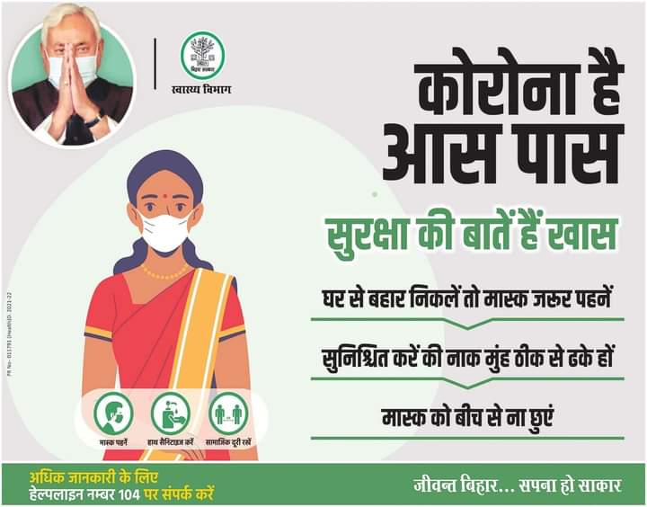 कोरोना है आस पास, सुरक्षा की बातें हैं खास। कोविड-19 संक्रमण से बचाव के लिए हमेशा सजग एवं सचेत रहें। हमेशा मास्क पहनें, दो गज की दूरी अपनाएं तथा बार-बार साबुन से हाथ धोएं। *जिला प्रशासन,सीतामढ़ी*