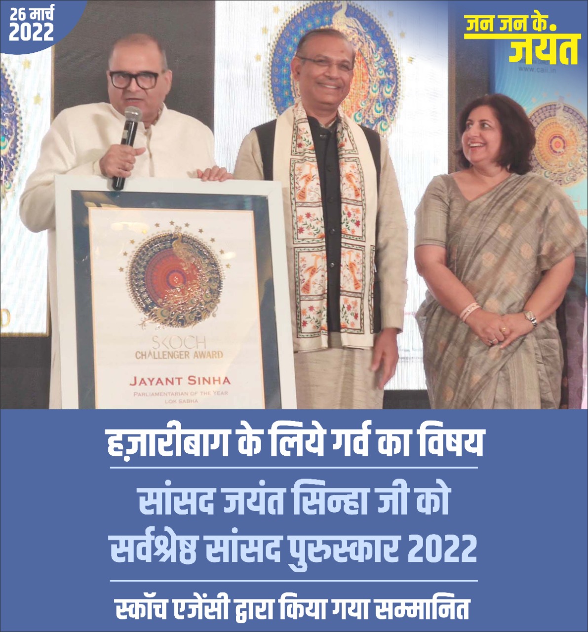 हजारीबाग के वर्तमान सांसद जयंत सिन्हा को स्कॉच एजेंसी द्वारा नई दिल्ली में एक कार्यक्रम के दौरान सर्वश्रेष्ठ सांसद का पुरस्कार दिया गया।ऑडियो पर क्लिक कर सुनें पूरी खबर को।