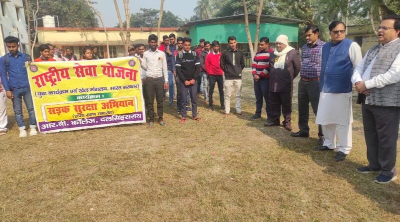 आरबी कॉलेज दलसिंहसराय में सड़क सुरक्षा अभियान के तहत शपथ ग्रहण समारोह का आयोजन स्थानीय रामाश्रय बालेश्वर महाविद्यालय दलसिंहसराय में प्रधानाचार्य प्रो. संजय झा के मार्गदर्शन एवं कार्यक्रम पदाधिकारी डॉ. सुनील कुमार सिंह के नेतृत्व में राष्ट्रीय सेवा योजना इकाई द्वारा सड़क सुरक्षा अभियान के तहत एक शपथ ग्रहण समारोह का आयोजन किया गया।कार्यक्रम पदाधिकारी डॉ. सिंह ने समारोह में उपस्थित सभी सदस्यों को ‘सड़क पर वाहन चलाते समय सुरक्षा संबंधी बातों का ध्यान रखने, यातायात नियमों का पालन करने एवं परिजनों से करवाने,दो पहिया वाहन चलाते समय हेलमेट पहनने,कार चलाते समय सीट बेल्ट लगाने, वाहन चलाते समय मोबाइल पर बात नहीं करने, एम्बुलेंस एवं फायर ब्रिगेड को जाने की जगह देने, सड़क दुघर्टना पीड़ितों की सहायता करने संबंधी शपथ दिलाई। प्रधानाचार्य प्रोफेसर झा ने अपने संबोधन में कहा कि सतर्कता के अभाव में सड़क दुघर्टना होती है। यदि हम सतर्क रहें एवं यातायात नियमों का पालन करें तो हम सड़क दुघर्टना से बच सकते हैं।