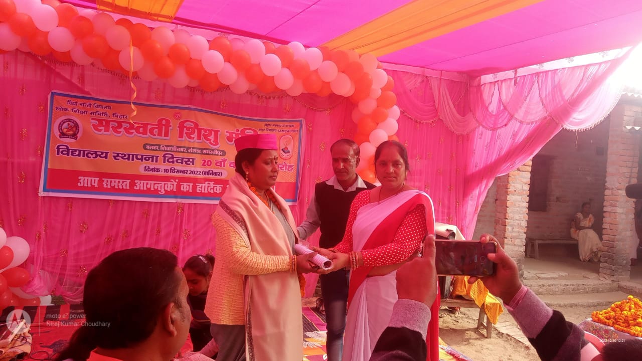 सरस्वती शिशु मंदिर बल्हा में मनाया गया 20 स्थापना दिवस फोटो एक शिवाजी नगर मोबाइल वाणी शिवाजीनगर रिपोर्टर मोनू कुमार चौधरी शिवाजी नगर प्रखंड क्षेत्र के बल्हा बरेठा स्थित सरस्वती शिशु मंदिर के प्रांगण में बड़े ही धूमधाम से 20 मां स्थापना दिवस मनाया गया मोके पर उपस्थित रोसरा विधायक वीरेंद्र पासवान एवं समस्तीपुर महिला आयोग अध्यक्ष नीलम साहनी शिवाजी नगर क्षेत्र संख्या 44 जिला पार्षद पति बबलू सिंह सरस्वती शिशु मंदिर प्रिंसिपल संजय कुमार झा सहायक अखिलेश कुमार झा आचार्य मैडम मनिता देवी एवं सभी के स्वागत के लिए कुछ संस्कृतिक कार्यक्रम का भी व्यवस्था किया गया था जिसका मुख्य कलाकार सरस्वती शिशु मंदिर प्रिंसिपल के पुत्री शालू झा थे एवं उनका सहायक तबला वादक एवं कलाकार के सभी साथी गण मौजूद थे बताते चलें कि भी 20 स्थापना दिवस के शुभ अवसर पर सरस्वती शिशु मंदिर के प्रिंसिपल के द्वारा सभी पत्रकार एवं सभी गणमान्य व्यक्ति को 20 स्थापना दिवस के शुभ अवसर पर आमंत्रित किया गया था एवं सभी को सम्मानित भी किया गया