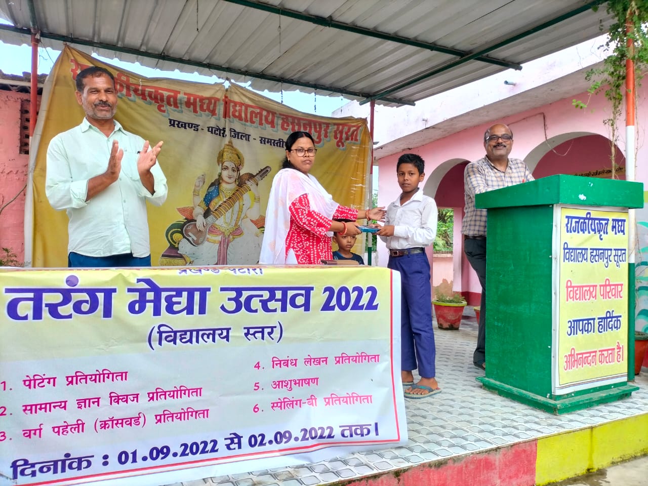 पटोरी प्रखंड के स्थनीय मध्य विद्यालय हसनपुर परिसर में तरंग मेघा उत्सव समारोह आयोजित किया गया. गौरतलब है कि समस्तीपुर जिले के पटोरी प्रखंड क्षेत्र के स्थानीय राजकृत मध्य विद्यालय हसनपुर सूरत परिसर में तरंग मेघा उत्सव आयोजित किया गया था। बताते चलें कि संस्कृतिक एवं अकादमिक में कुल 6 कैटेगरी यथा, सामान्य क्यूज , निबंध, आशु भाषण, स्पेलिंग बी कंपटीशन प्रतियोगिता इत्यादि का आयोजन किया गया था। इस कार्यक्रम में बढ़-चढ़कर छात्र-छात्राओं ने हिस्सा लिया। कार्यक्रम का निर्णायक की भूमिका दीपक कुमार, ब्रजभूषण प्रसाद सुमन ,सुप्रिया, अनामिका कुमारी के देखरेख में आयोजित की गई। प्रतियोगिता में क्यूज में पंकज कुमार एवं आदित्य राज , निबंध प्रतियोगिता में सुहानी कुमारी, आशु भाषण में शुभम कुमार, पेंटिंग प्रतियोगिता में रिचा कुमारी, स्पेलिंग बी में आयुष कुमार ने बाजी मारी सभी चयनित छात्र-छात्राओं को विद्यालय की ओर से प्रमाण पत्र व पुरस्कार दिया गया।विस्तृत जानकारी के लिए ऑडियो पर क्लिक करें।