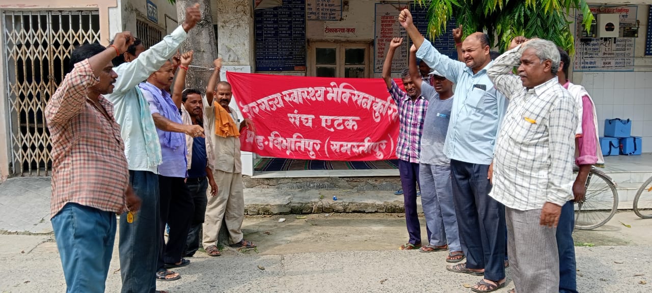 नियमित टीकाकरण कुरियर विभूतिपुर में विभिन्न मांगों को लेकर सभी कुटिया हड़ताल में। मांग इस प्रकार है। ग्रीन-चैनल- टेली वैक्सीन कार्य का बकाया मानदेय भुगतान करे। बकाया जुलाई 07 ,अगस्त 2022 है। कोविड टिका करण के किये गये कार्य माह मई, जुन, जुलाई अगस्त 2.022 तक का बकाया मानदेय भुगतान नहीं किया गया है। प्रभारी चिकित्सा पदाधिकरी के द्वारा बार-बार कहा जा रहा है कि सभी कुरियर को हटाकर उसपर FIR दर्ज करा देंगे। जब भी हम लोग बकाया मानदेय माँग करते है तब- तब प्रभारी द्वारा हटाने तथा FIR दर्ज कराने एवं धमकी देते है तथा कमीशन का भी मांग करते हैं। जबकी हमलोगो को सरकार के द्वारा मात्र 90.00 प्रति वैक्सिन कैरियर के हिसाब से भुगतान किया जाता हूँ जो मजदूरी से भी कम है। इसी को लेकर हमलोग को जब तक सभी तरह का भुगतान तथा कुरियर को हराने तथा FIR कि धमकी देना बंद नहीं करते हैं तब तक हमलोग हड़ताल पर रहेंगे। अंजनी कुमार पाण्डेय, विश्वनाथ महतो,रामाधार महातो , राम उदगार राम,शिवनारायण महती, विनोद कुमार भगत, रामउदगार सिंह, राजेश कुमार, सुधार कुमार।