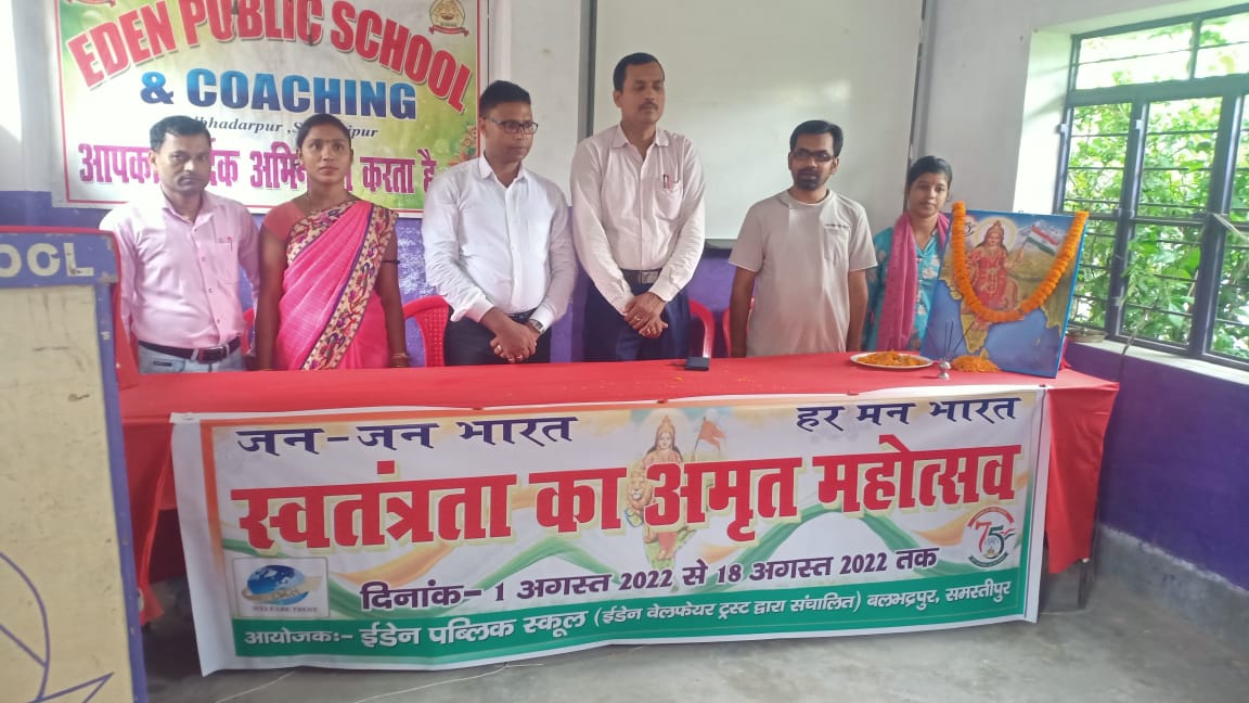 ईडेन वेलफेयर ट्रस्ट द्वारा आज़ादी के अमृत महोत्सव के सुअवसर पर ईडन पब्लिक स्कूल बलभद्रपुर दूधपुरा समस्तीपुर के छात्र छात्राओं के द्वारा निदेशक ब्रज किशोर कुमार के नेतृत्व मे शिक्षक,शिक्षार्थी एवं समाज की सहभागिता से विद्यालय प्रांगण मे भारतमाता की तस्वीर पर मुख्य अतिथि अमित कुमार वर्मा प्रमुख के साथ सभी शिक्षक शिक्षक शिक्षिकाएं संभागी नागरिकों द्वारा पुष्पांजली अर्पित एवं पूजन- आरती कर समाप्त हुई।परिसर के बाहर पोस्टर्स,बैनर, लगाये गये थे।विस्तार पूर्वक जानकारी के लिए क्लिक करें ऑडियो पर और सुनें पूरी खबर।