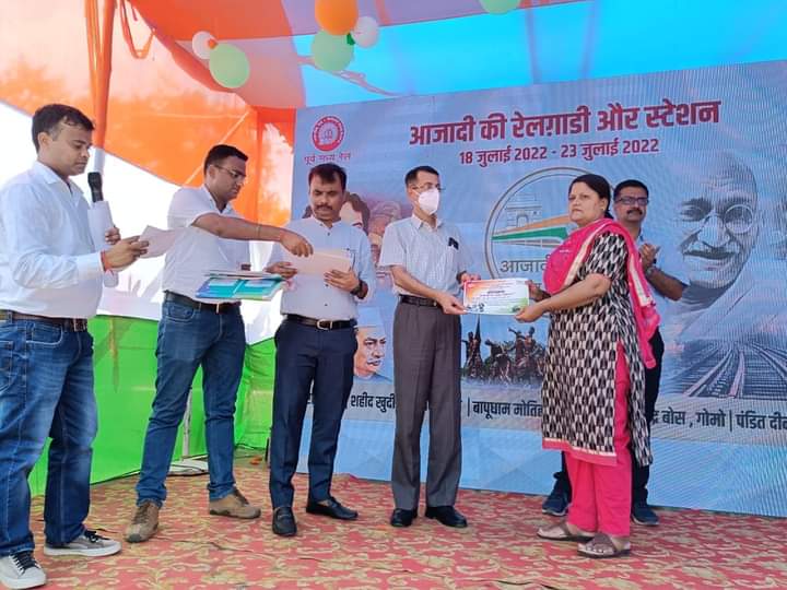आजादी के अमृत महोत्सव कार्यक्रम के तहत सर्वोदय उच्च विद्यालय वैनी पूसा की बिहार के उपमुख्यमंत्री से सम्मानित संगीत शिक्षिका राष्ट्रीय स्तर पर चर्चित समाजसेवी स्काउट गाइड कैप्टन सुश्री अमृता कुमारी को मंडल रेल प्रबंधक समस्तीपुर के द्वारा प्रशस्ति पत्र देकर सम्मानित किया गया बताते चलें कि सुश्री अमृता ने आजादी की रेलगाड़ी पर नुक्कड़ नाटक खुद से तैयार किया और बच्चों के द्वारा बेहतर प्रदर्शन करवाया। ऑडियो पर क्लिक कर सुनें पूरी खबर को।