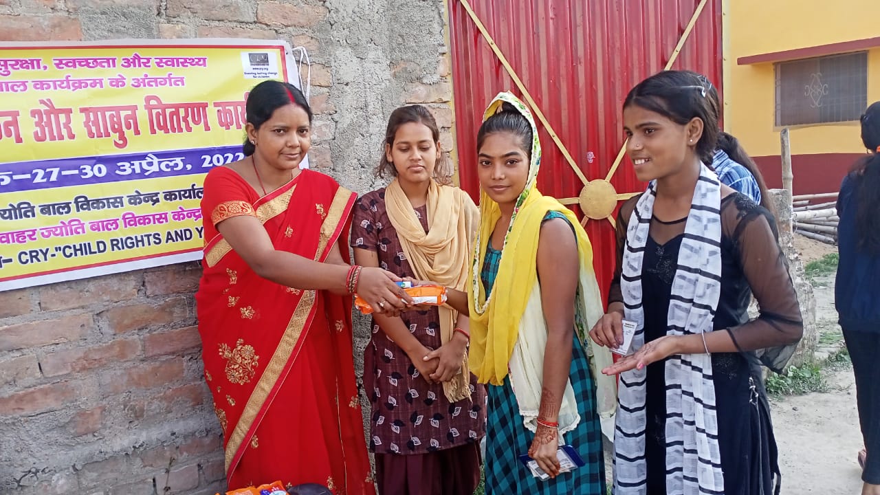 जवाहर ज्योति बाल विकास केन्द्र के द्वारा वारिसनगर प्रखंड अंतर्गत और समस्तीपुर नगर निगम के चकदीनदयाल सारी मुहल्ला में क्राई-"चाइल्ड राइट्स एंड यू" के सहयोग से 30 किशोरियों को बालिका सुरक्षा, स्वास्थ्य और स्वच्छता कार्यक्रम के तहत् मासिक धर्म के समय उपयोग के लिए स्वच्छता कीट दिया गया। सभी उपस्थित किशोरियों को इलाके की मसहुर सामाजसेविका सिग्मा कर्ण की अध्यक्षता में जवाहर ज्योति बाल विकास केन्द्र की एकाउंटेंट श्वेता कुमारी और कैलाश सत्यार्थी चिल्ड्रेन्स फाउंडेशन की सपोर्ट पर्सन दीप्ति कुमारी के हाथों से सैनिटरी नैपकिन व साबुन देकर मासिक श्राव के वक्त साफ-सफाई और पैड का उपयोग करने हेतु जागरुक किया गया। विस्तार पूर्वक जानकारी के लिए क्लिक करें ऑडियो पर और सुनें पूरी खबर।