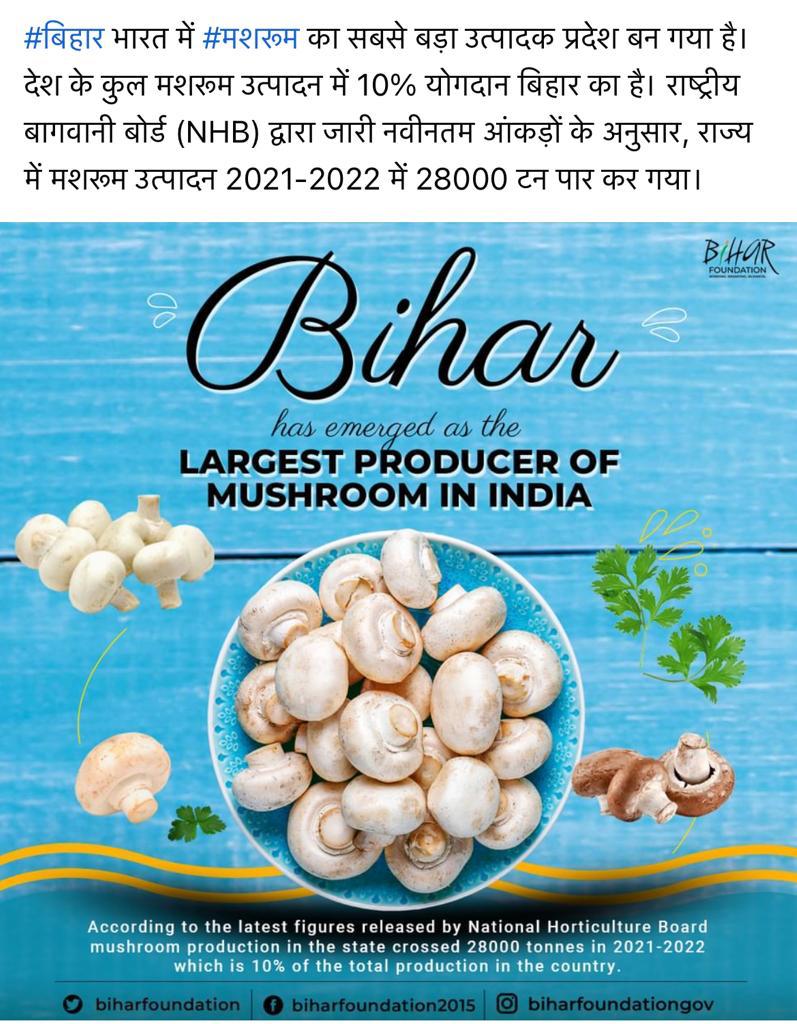 बिहार बना देश का सबसे अधिक मशरूम उत्पादन वाला राज्य डा राजेंद्र प्रसाद केंद्रीय कृषि विश्वविद्यालय के कुलपति डा रमेश चन्द्र श्रीवास्तव ने बताया है कि बिहार देश में सबसे अधिक मशरूम उत्पादन करने वाला राज्य बन गया है। उन्होंने कहा कि नेशनल हार्टीकल्चर बोर्ड से जारी आंकड़े के अनुसार बिहार में 2021-22 वर्ष में 28000टन मशरूम का उत्पादन हुआ है जो देश भर में मशरूम उत्पादन का दस प्रतिशत है। उन्होंने इसके लिये राज्य के मशरूम उत्पोदकों को बधाई दी। डा श्रीवास्तव ने मशरूम उत्पादन की ट्रेनिंग में उल्लेखनीय योगदान के लिये मशरूम के मुख्य वैज्ञानिक डा दयाराम की सरहाना करते हुये कहा कि यह उनके लिये बहुत ही हर्ष का विषय है कि जहां आज से कुछ वर्षों पहले यह धारणा थी कि मशरूम का उत्पादन सिर्फ पहाड़ी राज्यों में हो सकता है क्योंकि वहां लंबे समय तक ठंड पड़ती है। डा श्रीवास्तव ने कहा कि उन्होंने अपने पिछले पांच वर्ष के कार्यकाल में लगभग तीस से अधिक बड़े मशरूम प्लांट का उद्घाटन किया है जिसमें तापमान के अनुकूलन के कारण सालों भर मशरूम की खेती की जा सकती है। डा दयाराम ने कहा कि मशरूम एक ऐसी खेती है जिसमें खेत की जरूरत नहीं है इसलिये इससे जुड़कर सीमांत किसान भी आमदनी कर सकते है। विश्वविद्यालय के सूचना प्रभारी डा कुमार राज्यवर्धन ने कहा कि कुलपति डा श्रीवास्तव के निर्देश पर विश्वविद्यालय में मशरूम के ऐसे प्रभेद भी विकसित किये गये हैं जिसका उत्पादन गर्मी में भी किया जा सकता है। इसके अतिरिक्त विश्वविद्यालय में मशरूम के विभिन्न उत्पाद जैसे बिस्कुट, समोसा, नमकीन आदि बनाकर भी बिक्री की जाती है तथा युवाओं को इसका प्रशिक्षण भी दिया जाता है। विश्वविद्यालय के वैज्ञानिकों एवं कर्मचारियों ने इस उपलब्धि के लिये कुलपति डा श्रीराम और डा दयाराम को बधाई दी।
