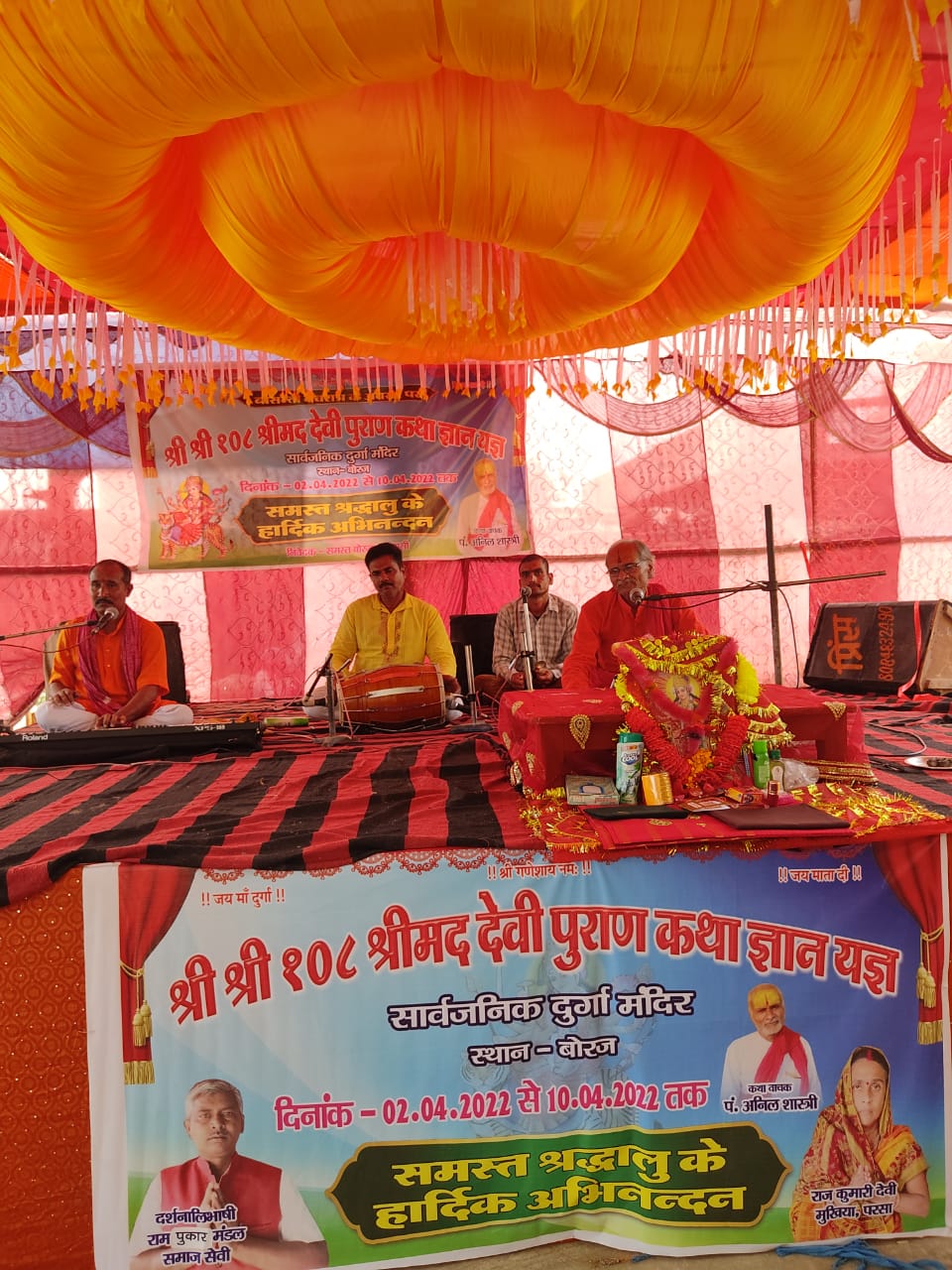जब जब धारा पर अत्याचार एवं पाप की वृद्धि होती है तो शक्ति स्वरूपा मां दुर्गा की अवतार होती है कथावाचक अनिल शास्त्री। फोटो 1 शिवाजीनगर, नौ दिवसीय श्रीमद् देवी भागवत कथा का आयोजन मैं मौजूद कथावाचक अनिल शास्त्री। समस्तीपुर मोबाइल वाणी शिवाजीनगर प्रखंड के परसा पंचायत के बोरज गांव मे चैत्र नवरात्र के अवसर पर नौ दिवसीय श्रीमद् देवी भागवत कथा का आयोजन किया गया । जिसका उद्घाटन मुखिया राजकुमारी देवी के द्वारा फीता काटकर किया गया। कथावाचक अनिल कुमार शास्त्री ने प्रथम दिन दुर्गा जी के अवतार के विषय मे विस्तार मे बताया कहा।उन्होने कहा मां दुर्गा में ने पृथ्वी पर राक्षसों के द्वारा बढ़ रहे अत्याचारों के कारण अवतार लेकर महिषासुर नामक राक्षस को बंद कर दिया। और पृथ्वी पर शांति की स्थापना की उन्होंने कहा जब जब धरा पर पापा और अत्याचार बढ़ते हैं तब तक तब शक्ति स्वरूपा माता दुर्गा अवतरित होती है। मौके पर राम पुकार सिंह, संजय कुमार झा, दयानंद झा, मुकेश झा, रामाकांत रमन, फूल झा सहित अन्य ग्रामीणों का सहयोग सराहनीय रहा