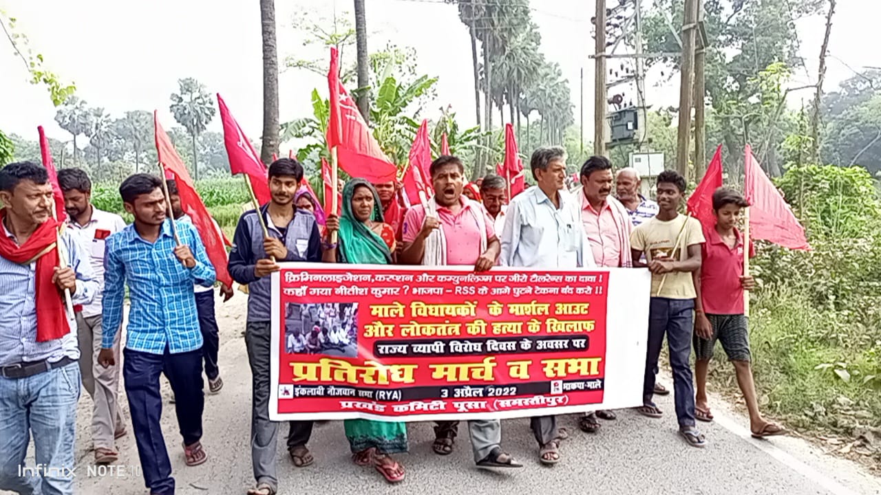 तिरहुत नहर गंडक परियोजना मोतीपुर कैंप मुजफ्फरपुर के द्वारा जबरन किसानों के जमीन पर नहर खोदने व बिहार विधान सभा से भाकपा माले विधायक को मार्शल आउट करने और लोकतंत्र की हत्या के खिलाफ माले का राज्यव्यापी विरोध दिवस के अवसर पर इंकलाबी नौजवान सभा व अखिल भारतीय किसान महासभा पूसा प्रखंड कमिटी के झंडे बैनर तले पूसा प्रखंड के कुबौलीराम पंचायत के वार्ड नंबर 01 अवस्थित मिल्की ग्राम में लगातार तीसरे दिन चल रहे किसानों का अनिश्चितकालीन महाधरना स्थल से प्रतिरोध मार्च निकाला गया।विस्तार पूर्वक जानकारी के लिए क्लिक करें ऑडियो पर और सुनें पूरी खबर।