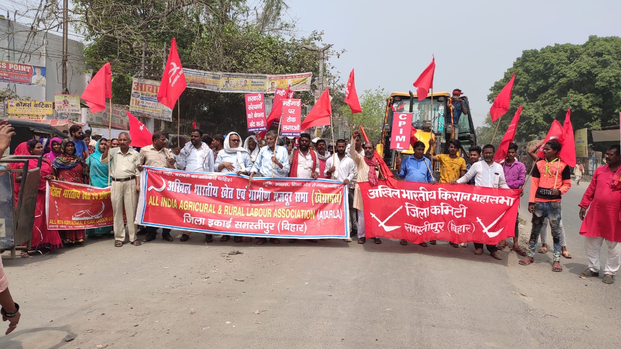 कमरतोड़ महंगाई, रिकॉर्ड बेरोजगारी, कम्पनी राज, निजीकरण, छटनीकरण, 4 श्रम कोड बिल, एमएसपी लागू करने में आनाकानी करने के ख़िलाफ़ ऐक्टू सहित 10 केंद्रीय ट्रेड यूनियनों के संयुक्त 2 दिवसीय राष्ट्रीय हड़ताल के अंतिम दिन मंगलवार को समस्तीपुर शहर के मालगोदाम चौक से खेग्रामस, किसान महासभा एवं भाकपा माले से जुड़े विभिन्न क्षेत्रों से बड़ी संख्या में कार्यकर्ताओं ने एकजुट होकर जुलूस निकाला.जुलूस में शामिल कार्यकर्ताओं ने नारे लगाते हुए स्टेशन रोड, रामबाबू चौक, टुनटुनिया गुमटी, आभरब्रीज, पुरानी बस स्टैंड, स्टेडियम गोलंबर, समाहरणालय होते हुए आभरब्रीज चौराहा पर जुलूस पहुंचकर सड़क जाम कर दिया. इस दौरान अपने-अपने हाथों में झंडे, बैनर, नारे लिखे फेसटून लहराते हुए कार्यकर्ताओं ने जमकर प्रदर्शन किया. जाम से सड़क की दोनों ओर गाड़ियों का तांता लग गया.विस्तृत जानकारी के लिए ऑडियो पर क्लिक करें।