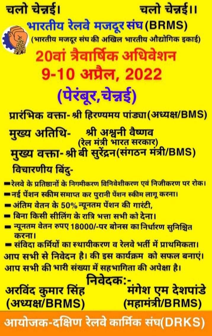 भारतीय रेलवे मजदूर संघ की दो दिवसीय 20 वाँ त्रि वार्षिक अखिल भारतीय अधिवेशन आगामी 9 एवं 10 अप्रैल 2022 को पेरंबूर (चेन्नई) में होने जा रही है इस कार्यक्रम के मुख्य अतिथि माननीय रेल मंत्री श्री अश्वनी वैभव जी होंगे यह जानकारी पूर्व मध्य रेलवे मजदूर संघ हाजीपुर के महामंत्री डॉo जितेन्द्र कुमार कंचन ने दी है। विस्तार पूर्वक जानकारी के लिए क्लिक करें ऑडियो पर और सुनें पूरी खबर।